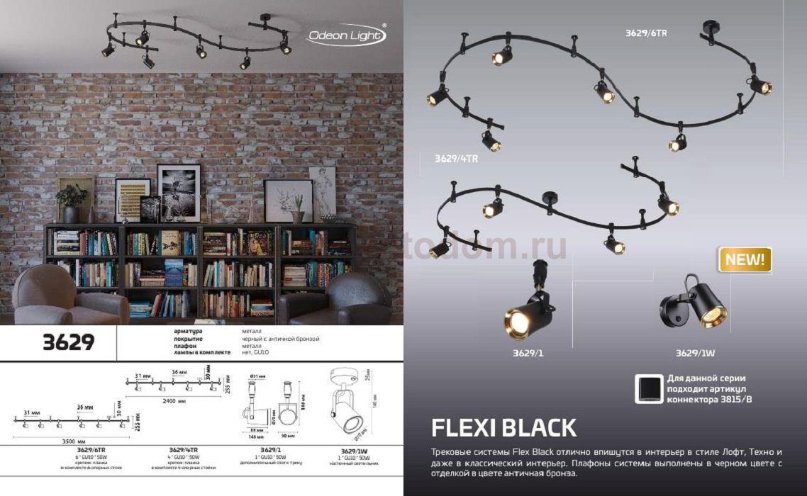 Храктерная особенность артикула 3629/4TR: Трековые системы Flexi Black являются эффективным, функциональным и стильным решением для основного освещения разного рода помещений, особенно вытянутых и изогнутых помещений со смещенным выводом питания, помещений любой геометрии. Благодаря вытянутой конструкции системы можно обеспечить равномерное освещение гораздо большей площади, чем при использовании стандартной люстры c лампами аналогичной мощности, причем плафоны можно перемещать, регулировать их положение и компоновку. Благодаря небольшой высоте светильник отлично подойдет для комнат с невысокими потолками. Длина шины составляет 2400 мм, также в комплект входит 4 опорных стойки и 4 регулируемых плафонов. Светильник выполнен в черном цвете в сочетании с элементами в цвете античной бронзы, и идеально подойдет для самых разных стилей: лофт, Техно, Ретро, Винтаж. Для дополнительной установки на шину можно приобрести дополнительно плафоны. Для светильника необходимо приобретение дополинтельных ламп GU10 50W.