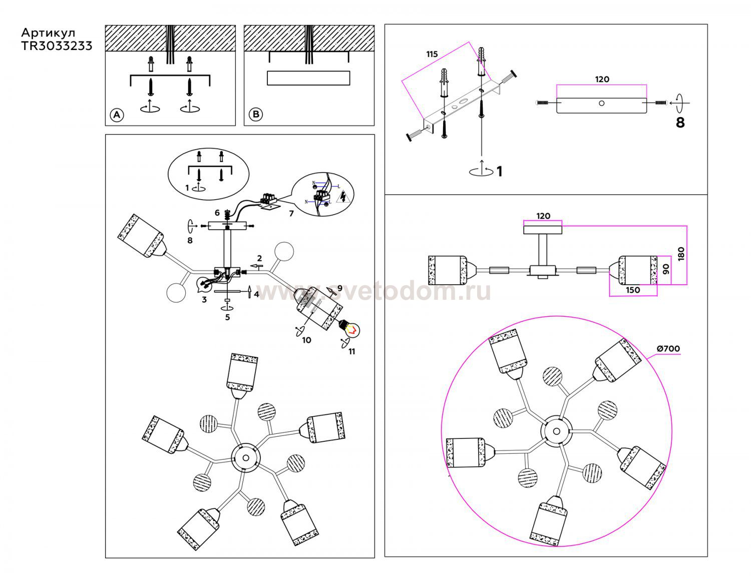 ![]() Люстра на штанге со стеклянными плафонами Ambrella TR303043/8 WH белый E27/8 max 60W 820*820*260 10470 руб.