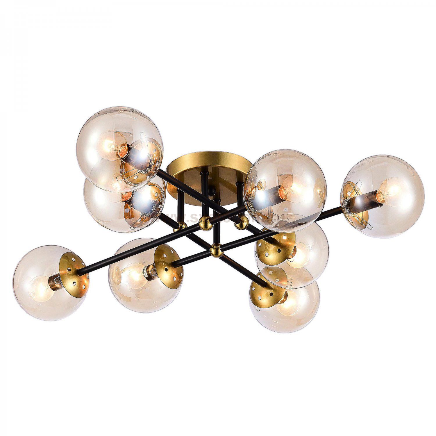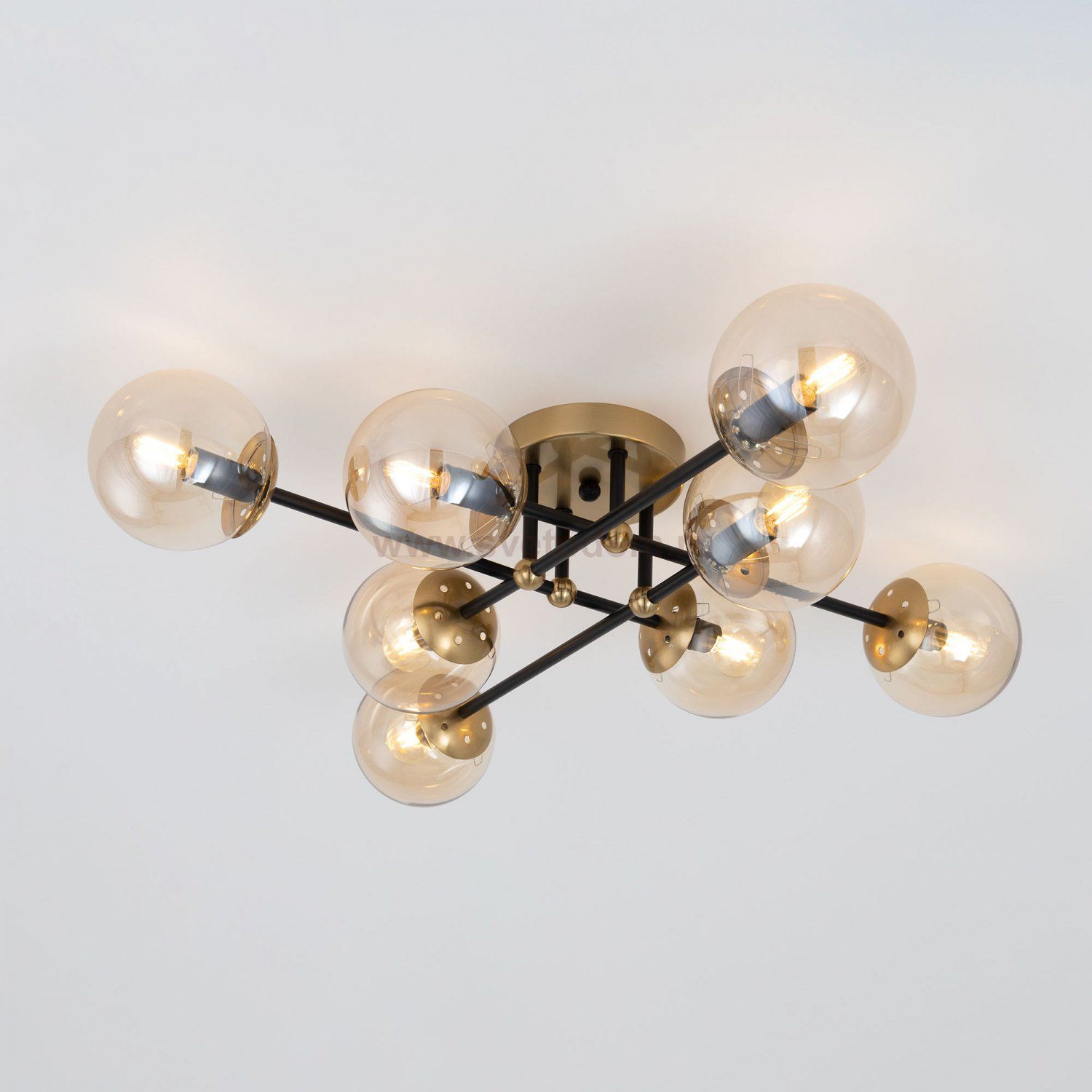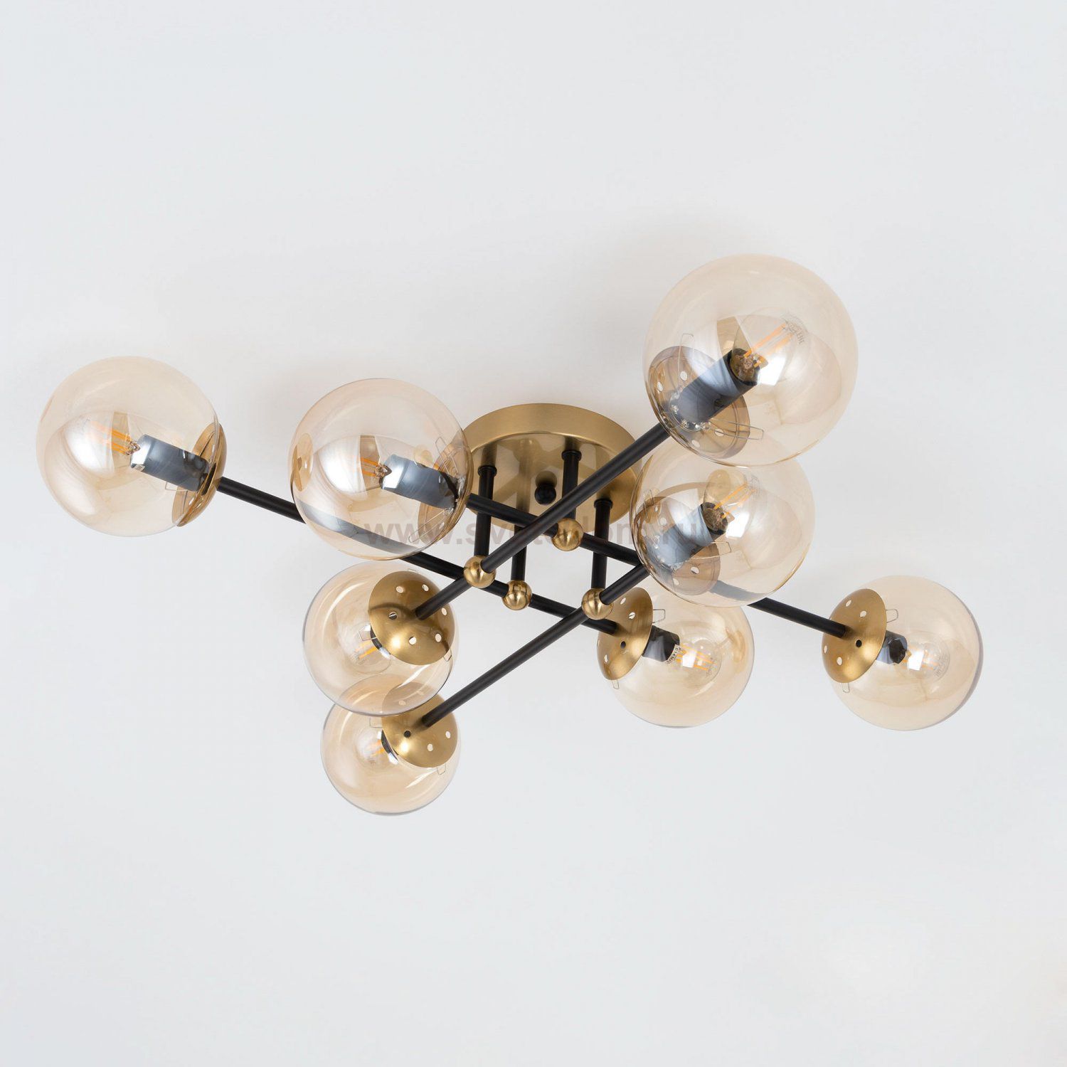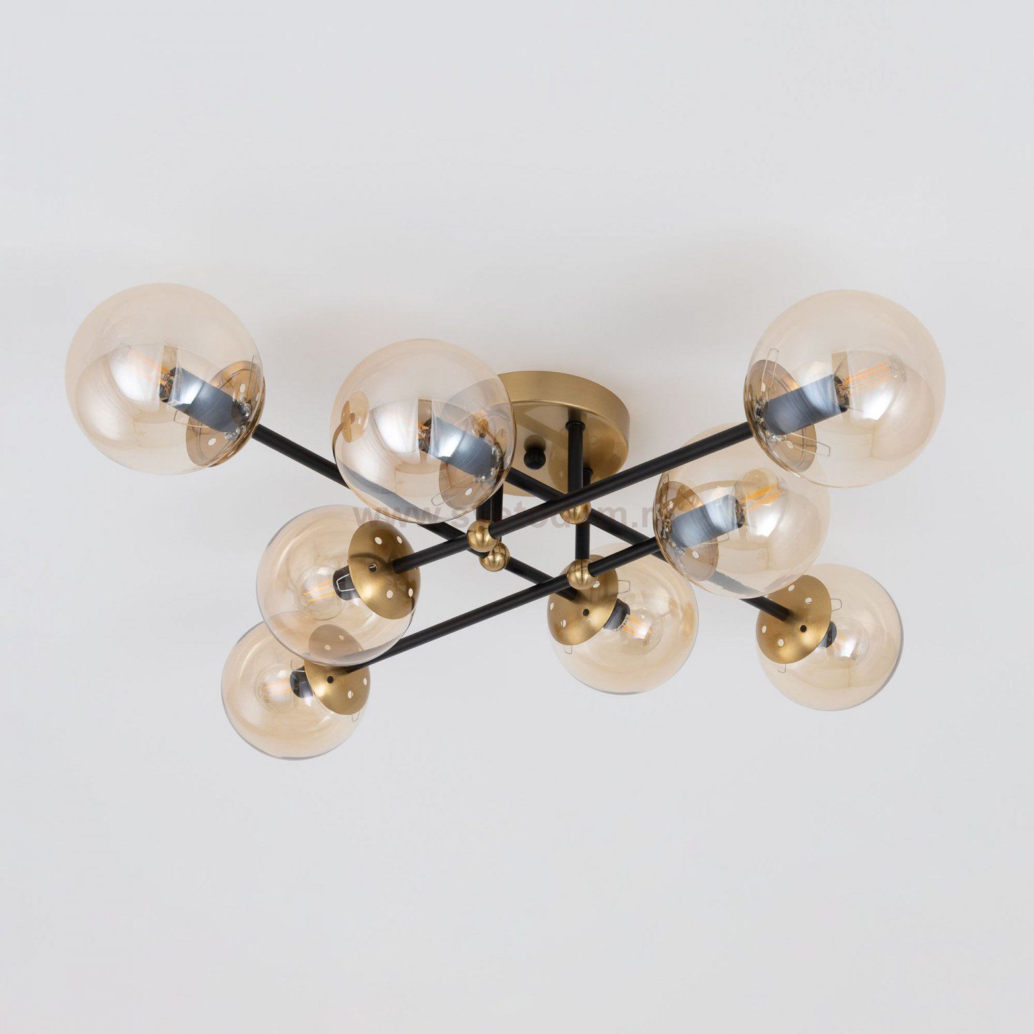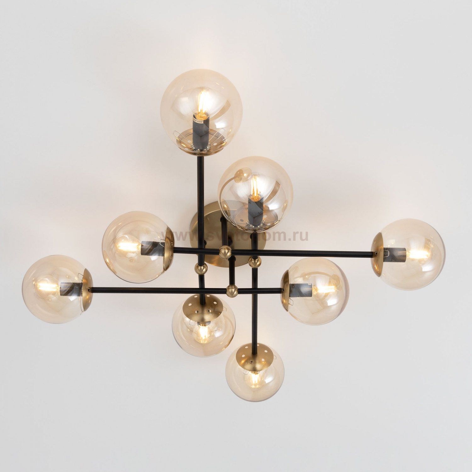 Стильная потолочная люстра Citilux Памела CL144185 для модных интерьеров, оформленных в стиле сканди, модерн или лофт. Корпус светильника металлический, цвет – сочетание чёрного и бронзы. Основание круглое, рожки-штанги расположены параллельно потолку. Плафоны в форме шара, изготовлены из прозрачного стекла светло-янтарного оттенка. В изделии используются 8 ламп с цоколем Е14, максимальной мощностью для ламп накаливания 40Вт. Светодиодные лампы можно устанавливать более яркие. Подходит для всех типов потолков, в том числе натяжных, тип крепления – планка.