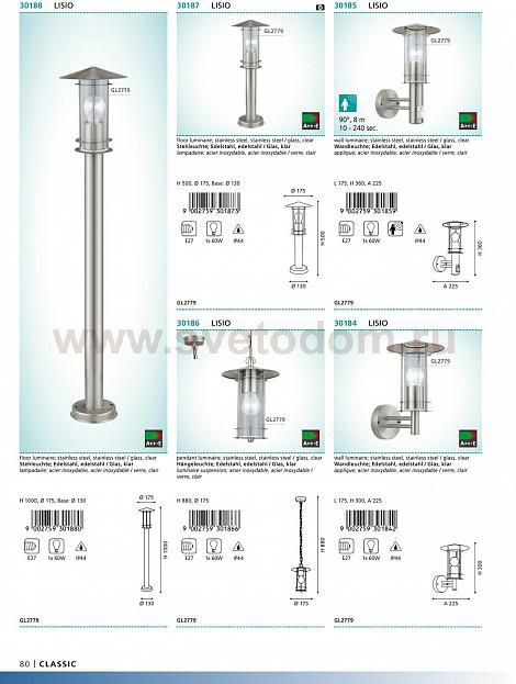 Обеспечение качественного уличного освещения – важная задача для владельцев коттеджей. Компания «Светодом» предлагает современные светильники, которые порадуют Вас отличным исполнением. В нашем каталоге представлена продукция известных производителей, пользующихся популярностью благодаря высокому качеству выпускаемых товаров. Уличный светильник Eglo 30185 не просто обеспечит качественное освещение, но и станет украшением Вашего участка. Модель выполнена из современных материалов и имеет влагозащитный корпус, благодаря которому ей не страшны осадки. Купить уличный светильник Eglo 30185, представленный в нашем каталоге, можно с помощью онлайн-формы для заказа. Чтобы задать имеющиеся вопросы, звоните нам по указанным телефонам.