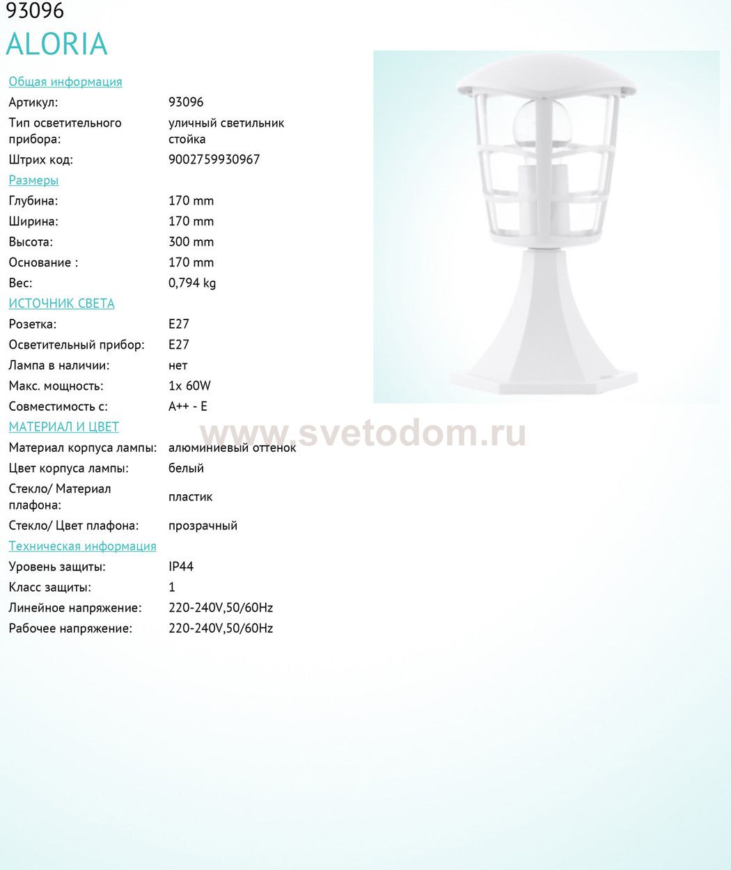 Обеспечение качественного уличного освещения – важная задача для владельцев коттеджей. Компания «Светодом» предлагает современные светильники, которые порадуют Вас отличным исполнением. В нашем каталоге представлена продукция известных производителей, пользующихся популярностью благодаря высокому качеству выпускаемых товаров. Уличный светильник Eglo 93096 не просто обеспечит качественное освещение, но и станет украшением Вашего участка. Модель выполнена из современных материалов и имеет влагозащитный корпус, благодаря которому ей не страшны осадки. Купить уличный светильник Eglo 93096, представленный в нашем каталоге, можно с помощью онлайн-формы для заказа. Чтобы задать имеющиеся вопросы, звоните нам по указанным телефонам.