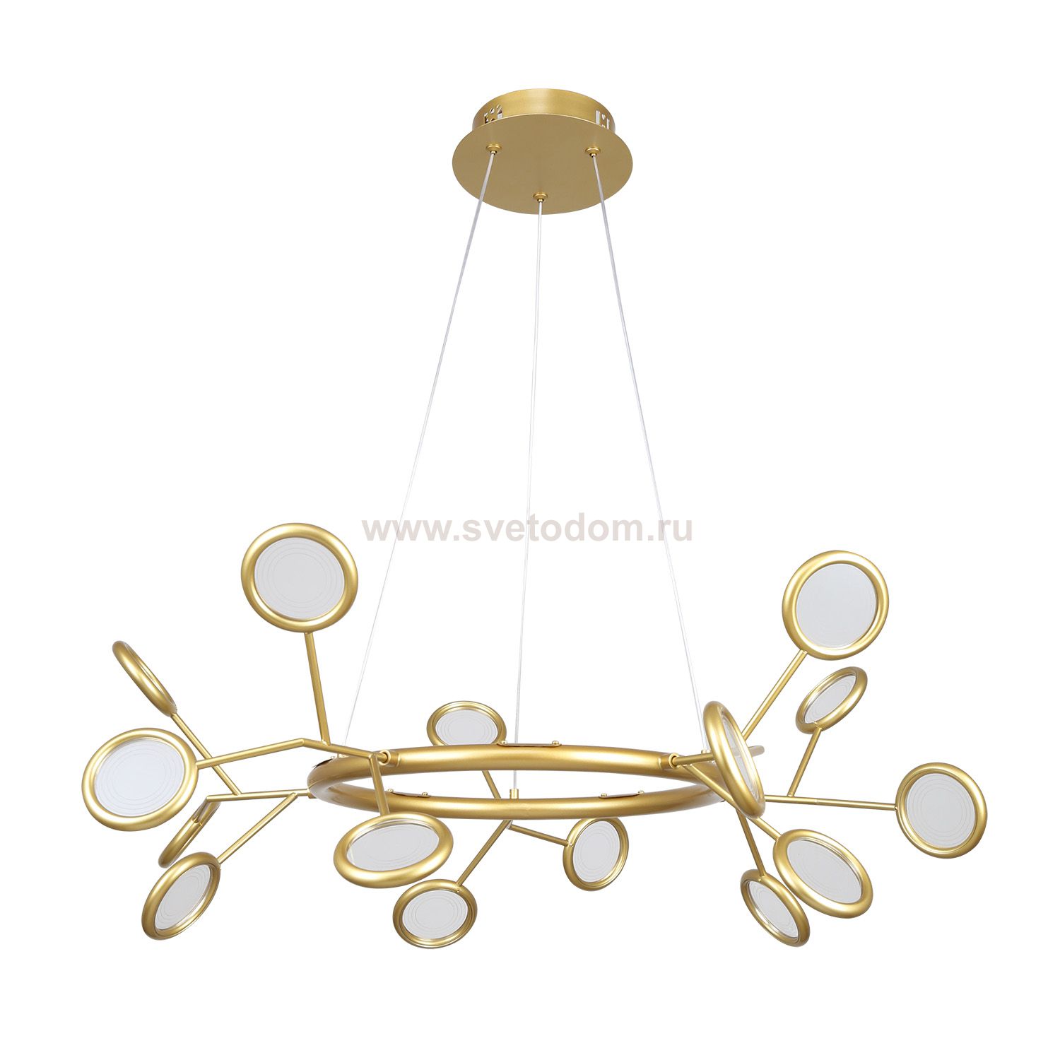 Подвесная люстра с матовым золотым каркасом, внутренний периметр плафонов подсвечен лентой-LED, 3D-эффект усиливается за счет нанесенного на акрил кру Серия