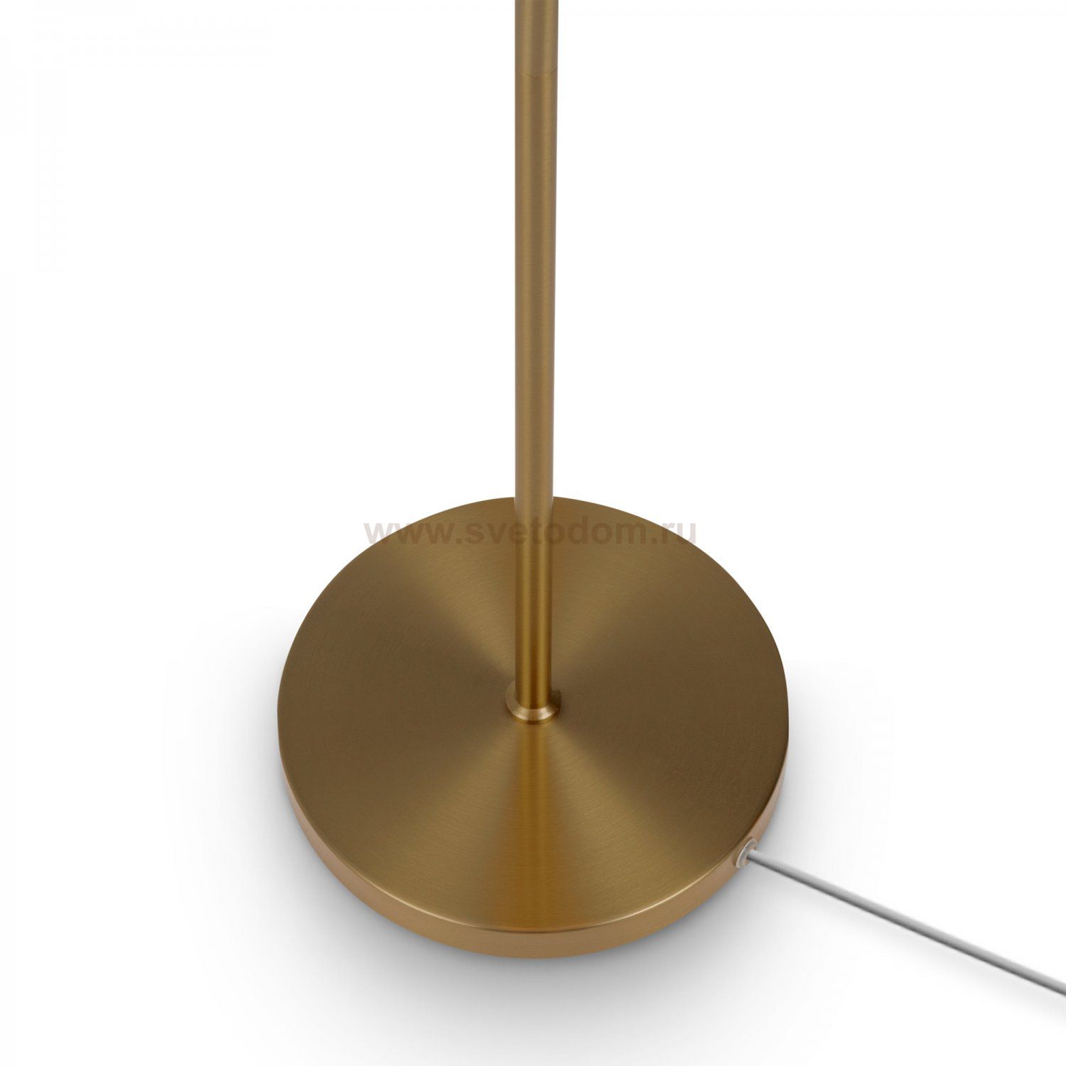 Металлическая арматура в цвете латунь. Дополнительные элементы — минималистичные вставки из натурального белого мрамора. Белые абажуры из ткани в форме конуса. Источник света — лампа с цоколем Е14 или Е27.