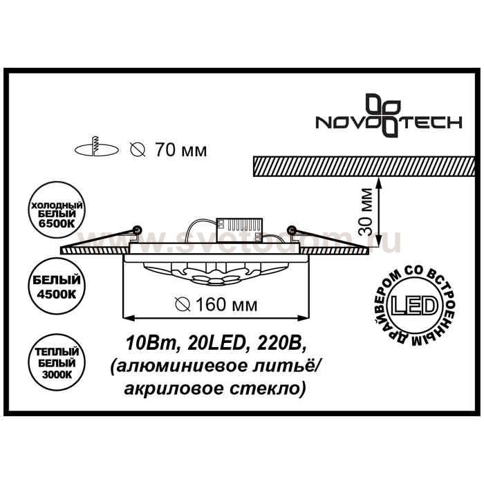 Встраиваемый светодиодный светильник со встроенным драйвером модели Novotech 357316 из серии LAGO отличается следующим качеством: Светильник выполнен из акрилового стекла. Акриловое стекло обладает рядом преимуществ, например:- высокая прозрачность (92%, которая сохраняет свой цвет и не меняется с течением времени); - отсутствие осколков при ударе (прочность оргстекла в 5 раз выше, чем у простого стекла); - водостойкость; - легкость материала (оргстекло гораздо легче, почти в 2,5 раза, по сравнению с обычным стеклом); - высокая пропускная способность ультрафиолетовых лучей, которая составляет около 73%.