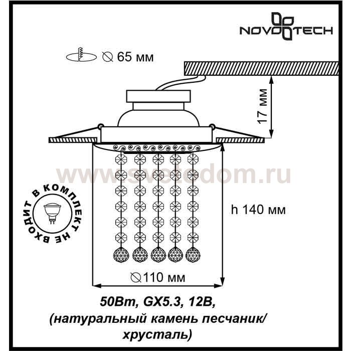 Декоративный встраиваемый светильник модели Novotech 370068 из серии PATTERN отличается следующим качеством: Корпус светильника произведен из натурального камня песчаника. Его главные преимущества - долговечность, уникальные экологические и бактерицидные качества, чистота цвета, однородность структуры, малое влагопоглощение. Подвески сделаны из хрусталя. Он обладает высоким показателем плотности, прозрачности и блеска. Благодаря содержанию свинца (не менее 30%) и определённому подбору углов, образуемых гранями, изделия из хрусталя отличаются необыкновенно яркой, многоцветной игрой света, чарующей магией красоты, совершенства и роскоши.