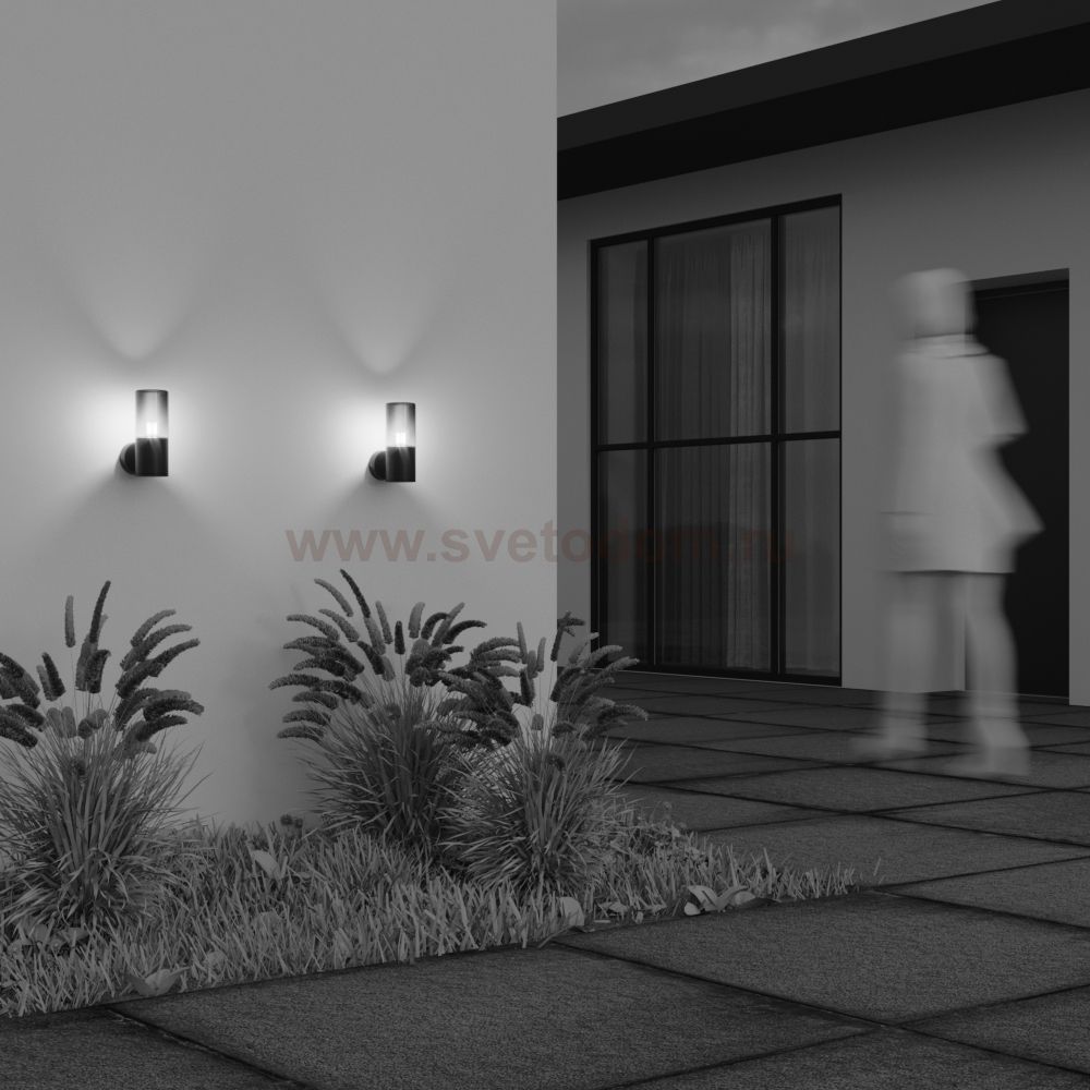 Алюминиевый корпус, цвет - графит. Световой элемент - тонированное стекло. Источник света - лампа с цоколем Е27. Универсальная серия для современных и классических экстерьеров. Защита IP54.