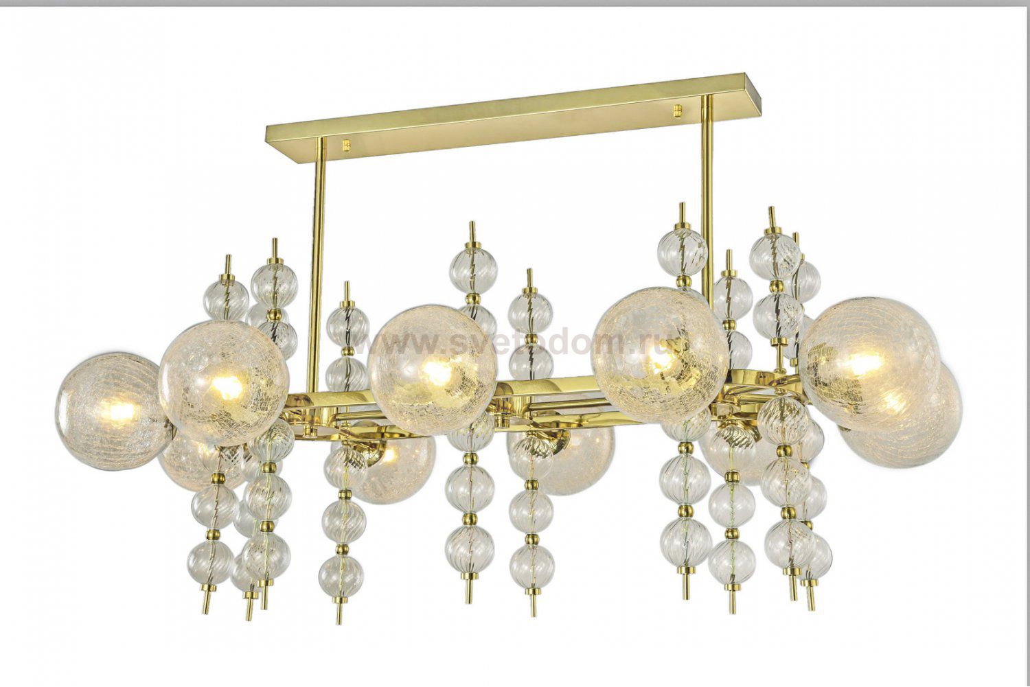 Люстра Marine Ten сложной конструкции, с большим количеством сферических элементов. Два кронштейна верхними концами крепятся к потолочной планке, а нижними – удерживают плоскую металлическую основу в виде вытянутого овала, от которой отходят десять коротких держателей для ламп.