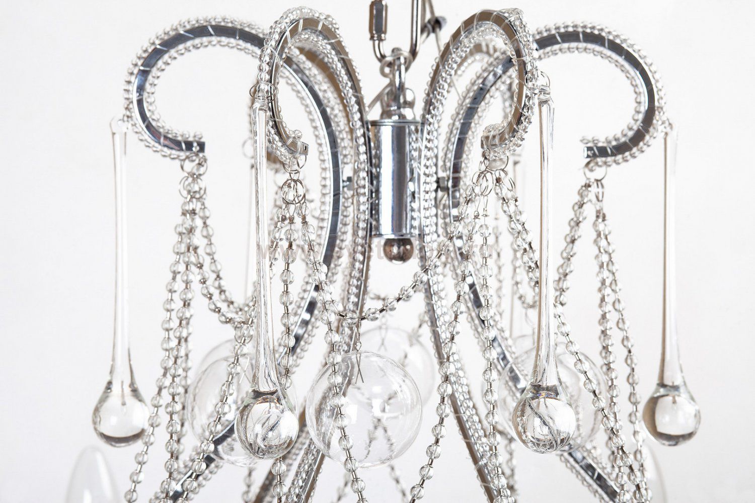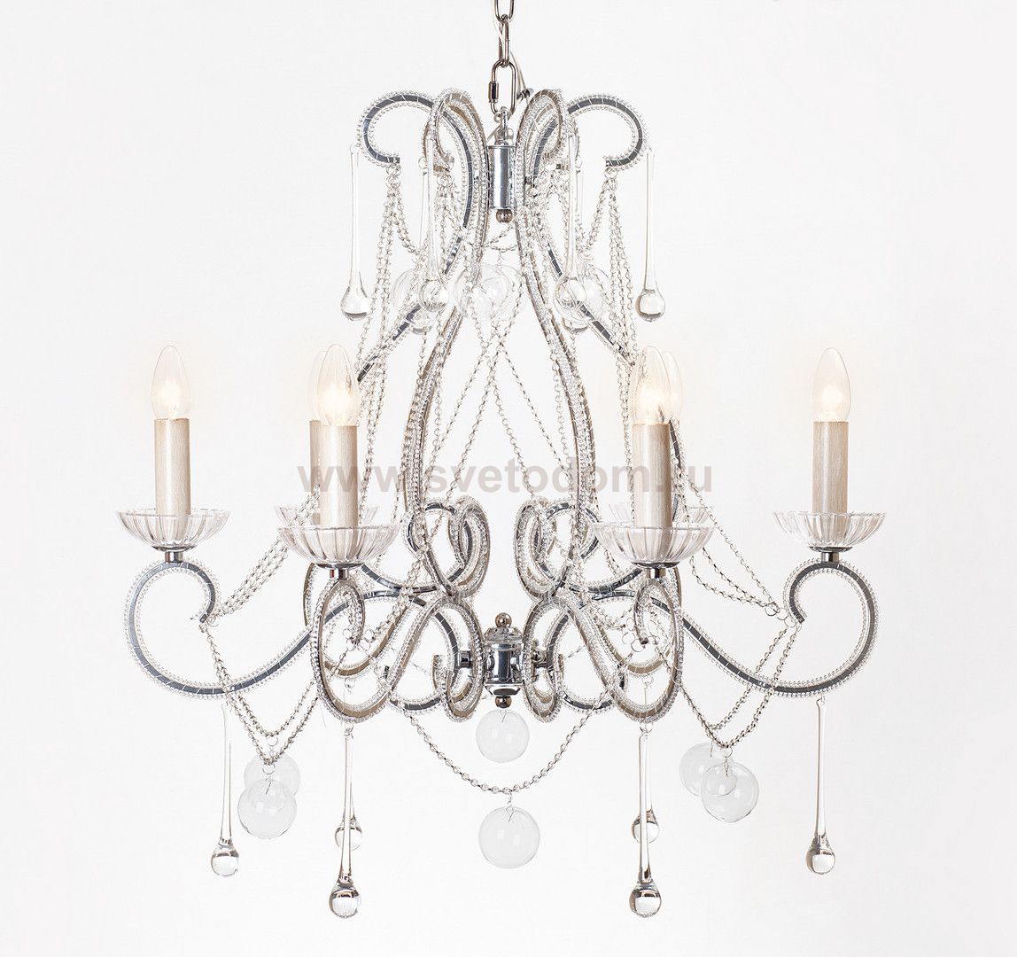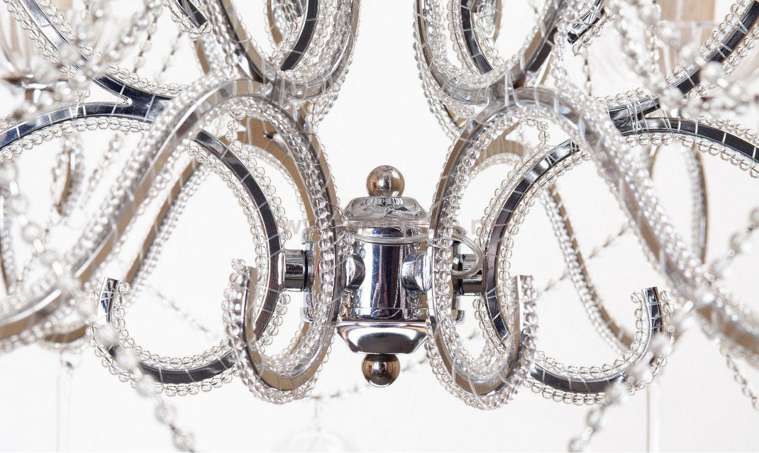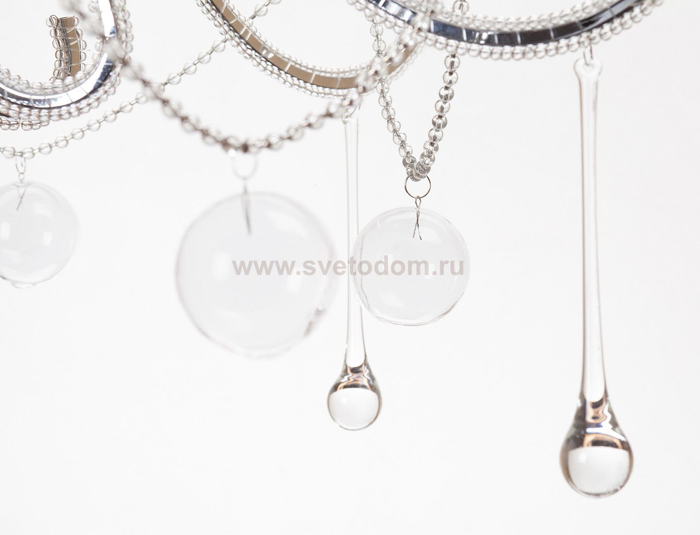 От основания отходят тонкие трубки с рельефной поверхностью, которые изящно изгибаясь и переплетаясь между собой, в нижней части образуют держатели для ламп. Модель по всей поверхности украшена тонкими металлическими цепочками и прозрачными стеклянными шарами разных форм.