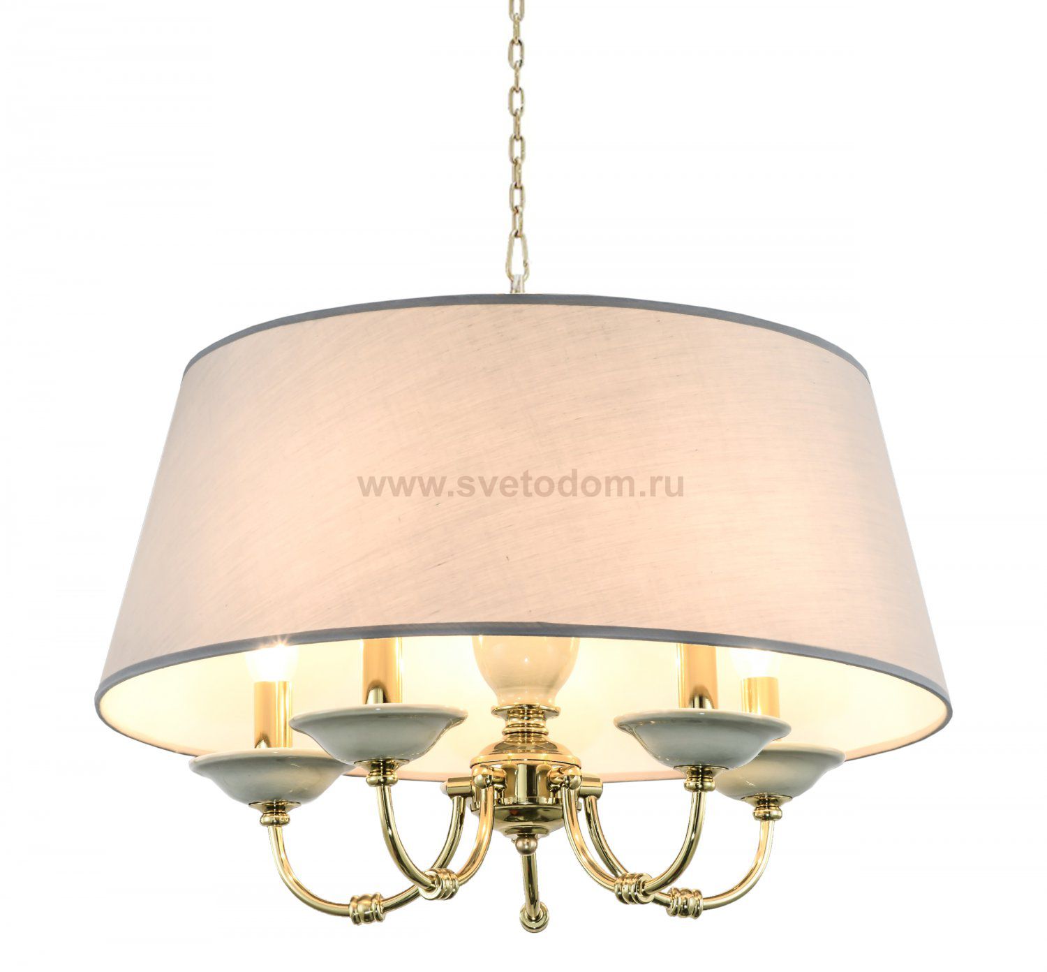 Люстра Paolitta на подвесной цепочке регулируемой длины. Оснащена цоколем типа E14, крепится на потолочную планку. Круглый тканевый абажур расширяется сверху вниз, в качестве источников освещения используются 5 лампочек, расположенных на изящно изогнутых металлических держателях цвета «золото».
