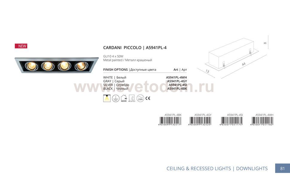 Светильник потолочный Arte lamp A5941PL-4SI CARDANI в большинстве своем является техническим освещением и носит больше практический эффект, нежели декоративный. С данной моделью светильника Вы сможете качественно и функционально осветить как жилые, так и общественные помещения. Также в коллекции Вы сможете выбрать другой типоразмер или оттенок для доходящего дизайн-проекта помещения.