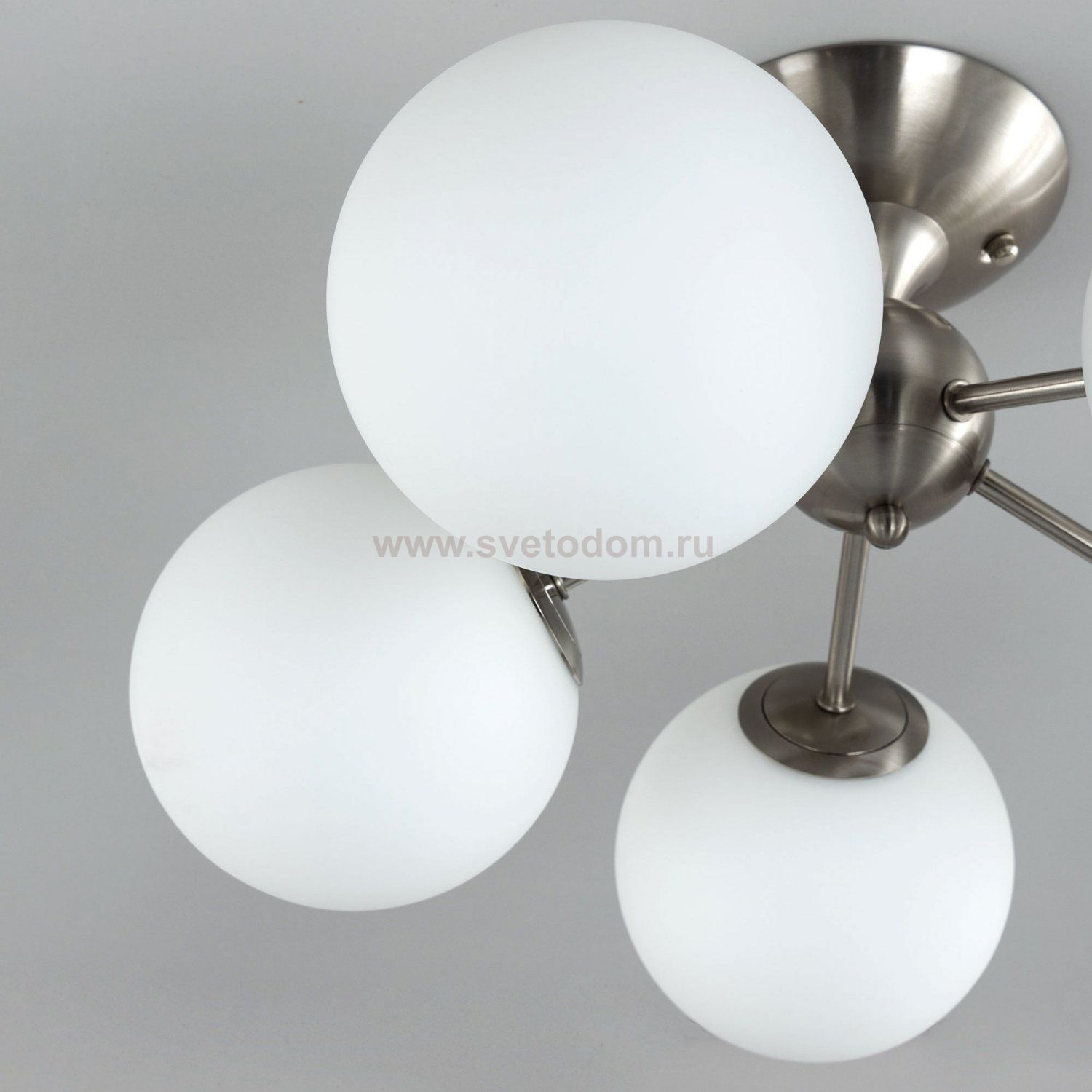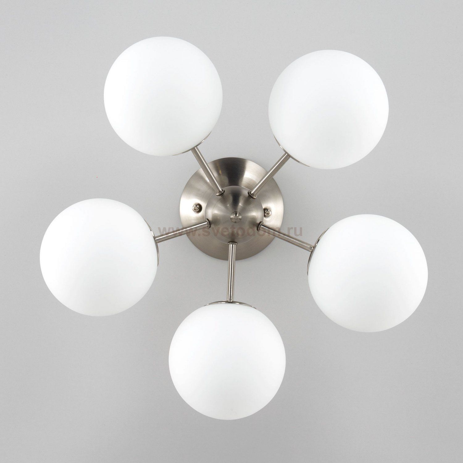 Потолочная люстра Citilux Томми CL102154 для интерьеров, оформленных в современном стиле. Корпус металлический, цвет матовый хром. Плафоны стеклянные, в форме шара, цвет белый матовый. В изделии 5 ламп с цоколем Е14, максимальной мощностью для ламп накаливания 40Вт. Светодиодные лампы можно использовать более яркие. Площадь освещения около 12м². Модель подходит для всех типов потолков, в том числе натяжных. Тип крепления-планка.