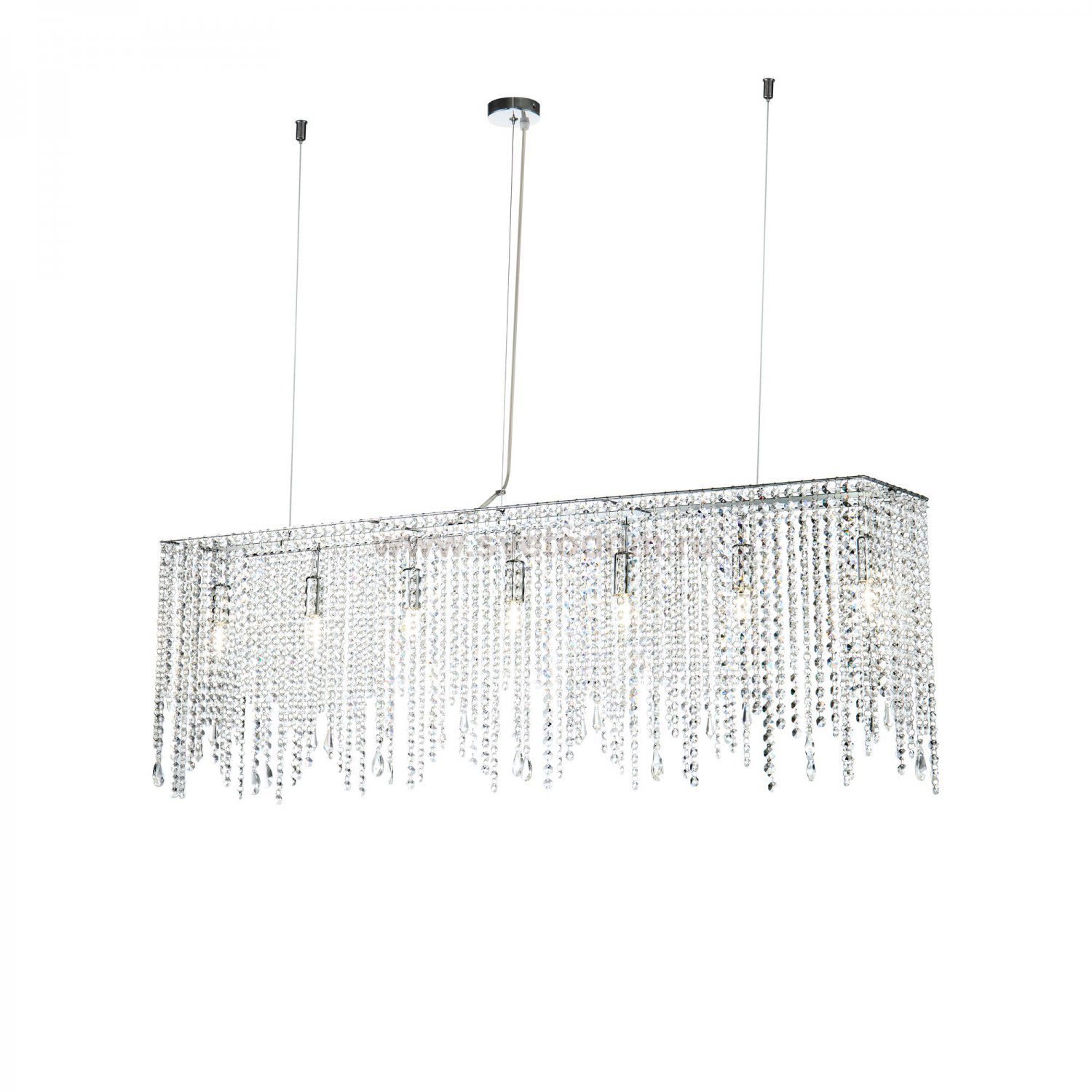 Арматура из металла в цвете хром. Декор – подвески из прозрачного хрусталя. Оригинальная прямоугольная форма. Высота светильников регулируется тросом.