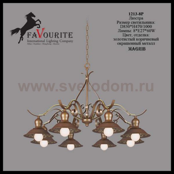 Компания «Светодом» предлагает широкий ассортимент люстр от известных производителей. Представленные в нашем каталоге товары выполнены из современных материалов и обладают отличным качеством. Благодаря широкому ассортименту Вы сможете найти у нас люстру под любой интерьер. Мы предлагаем как классические варианты, так и современные модели, отличающиеся лаконичностью и простотой форм. Стильная люстра Favourite 1213-8P станет украшением любого дома. Эта модель от известного производителя не оставит равнодушным ценителей красивых и оригинальных предметов интерьера. Люстра Favourite 1213-8P обеспечит равномерное распределение света по всей комнате. При выборе обратите внимание на характеристики, позволяющие приобрести наиболее подходящую модель. Купить понравившуюся люстру по доступной цене Вы можете в интернет-магазине «Светодом». |