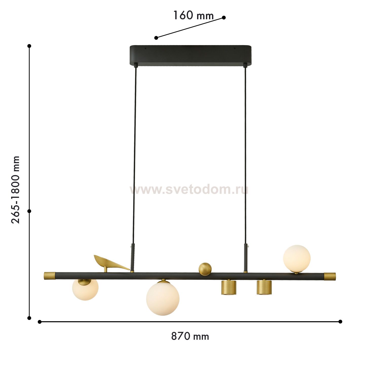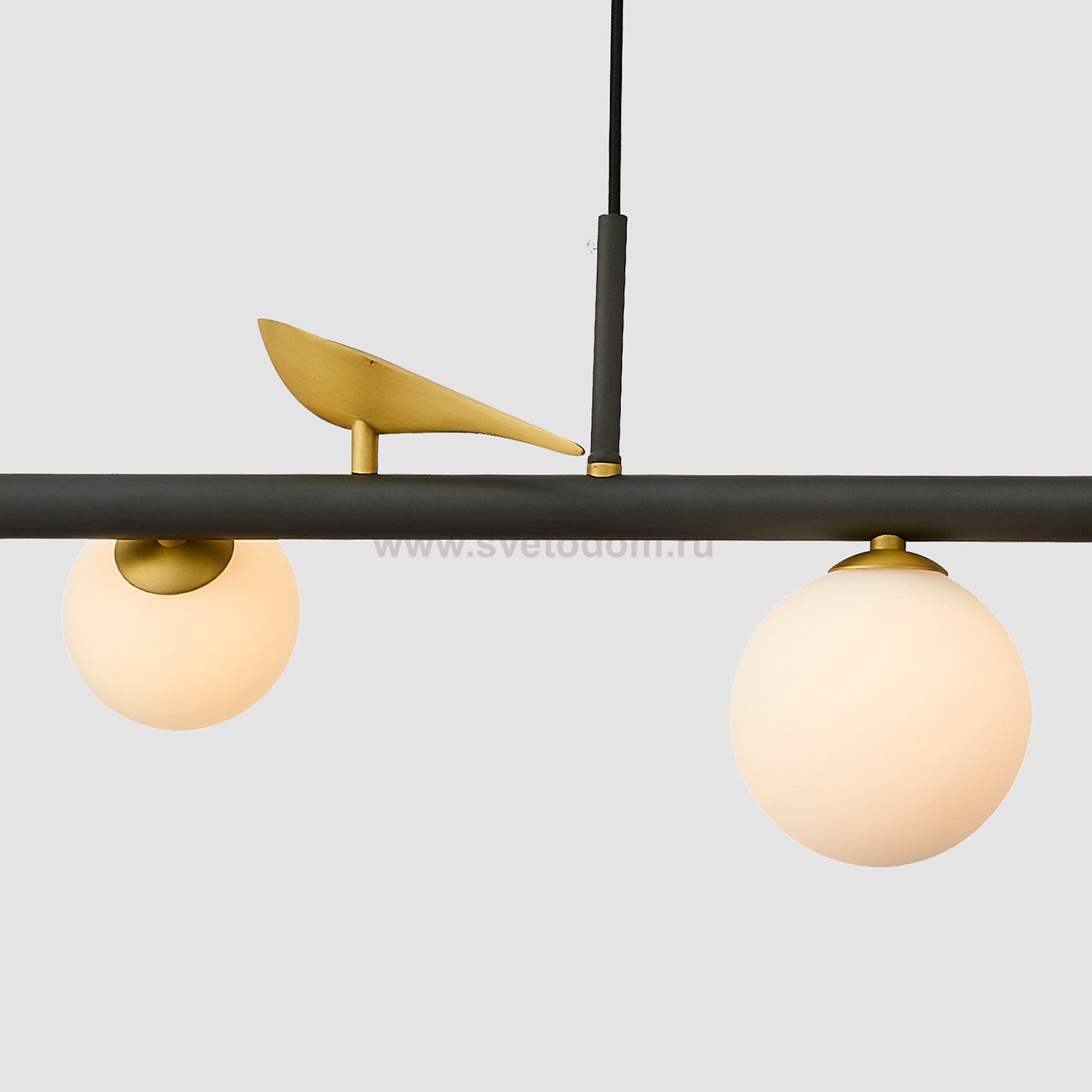 Подвесная люстра длиной 87 см с черным матовый каркасом, круглые белые плафоны выполненные из выдувного стекла, золотой декоративный элемент в виде пт Декор
