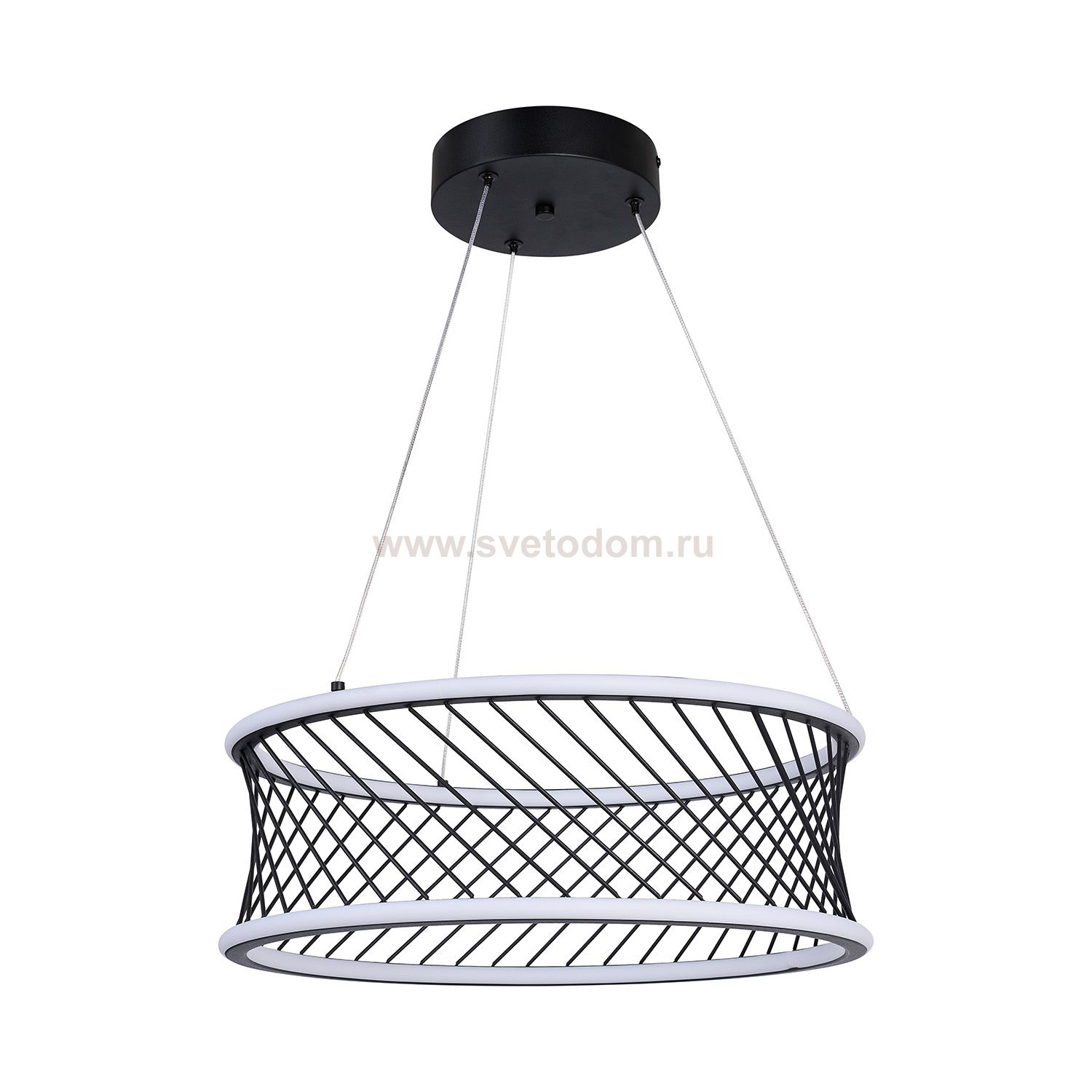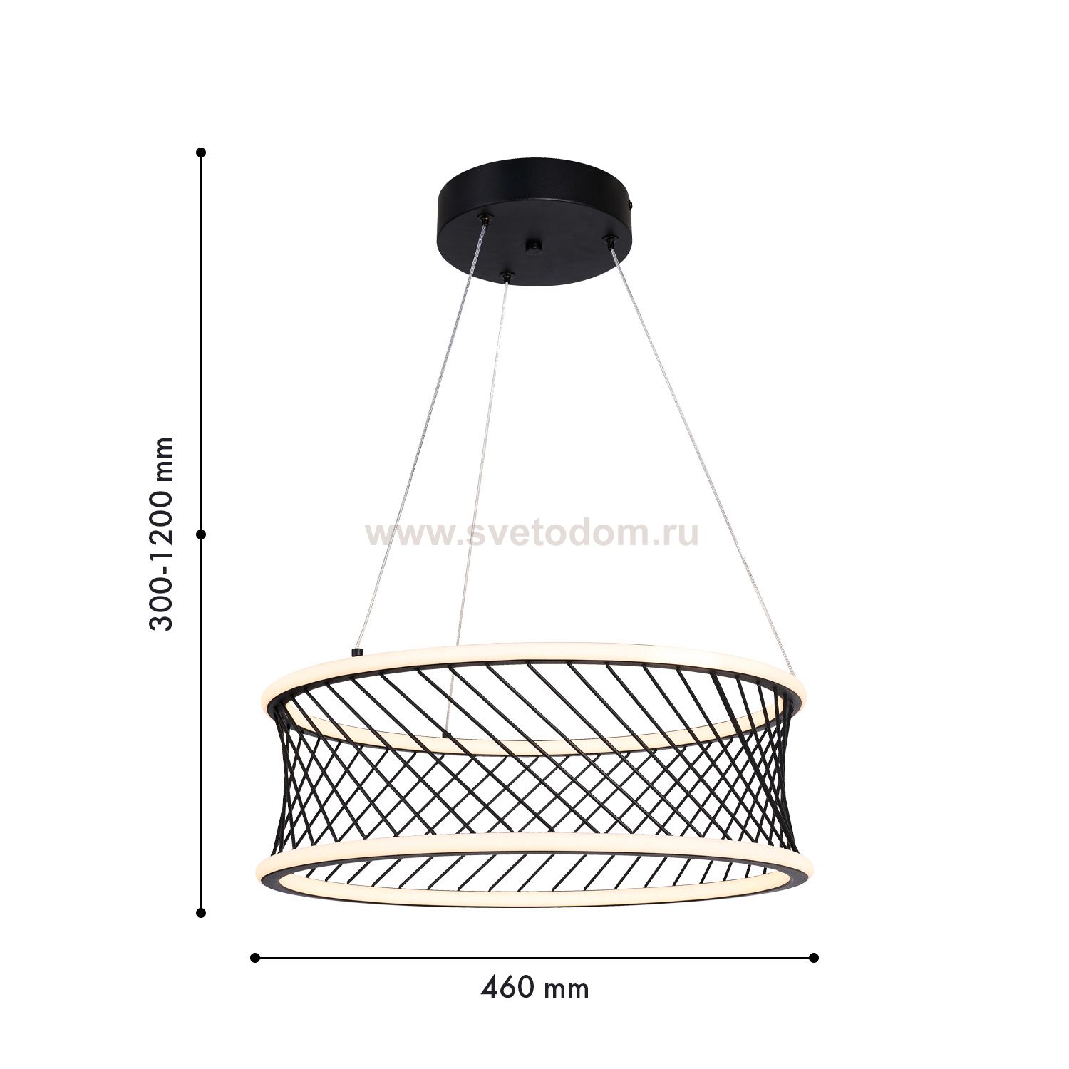 Округлое верхнее и нижнее основание черного цвета, LED-лента, регулируется пультом управления. Плафон - решетка из черных матовых металлических прутик Серия