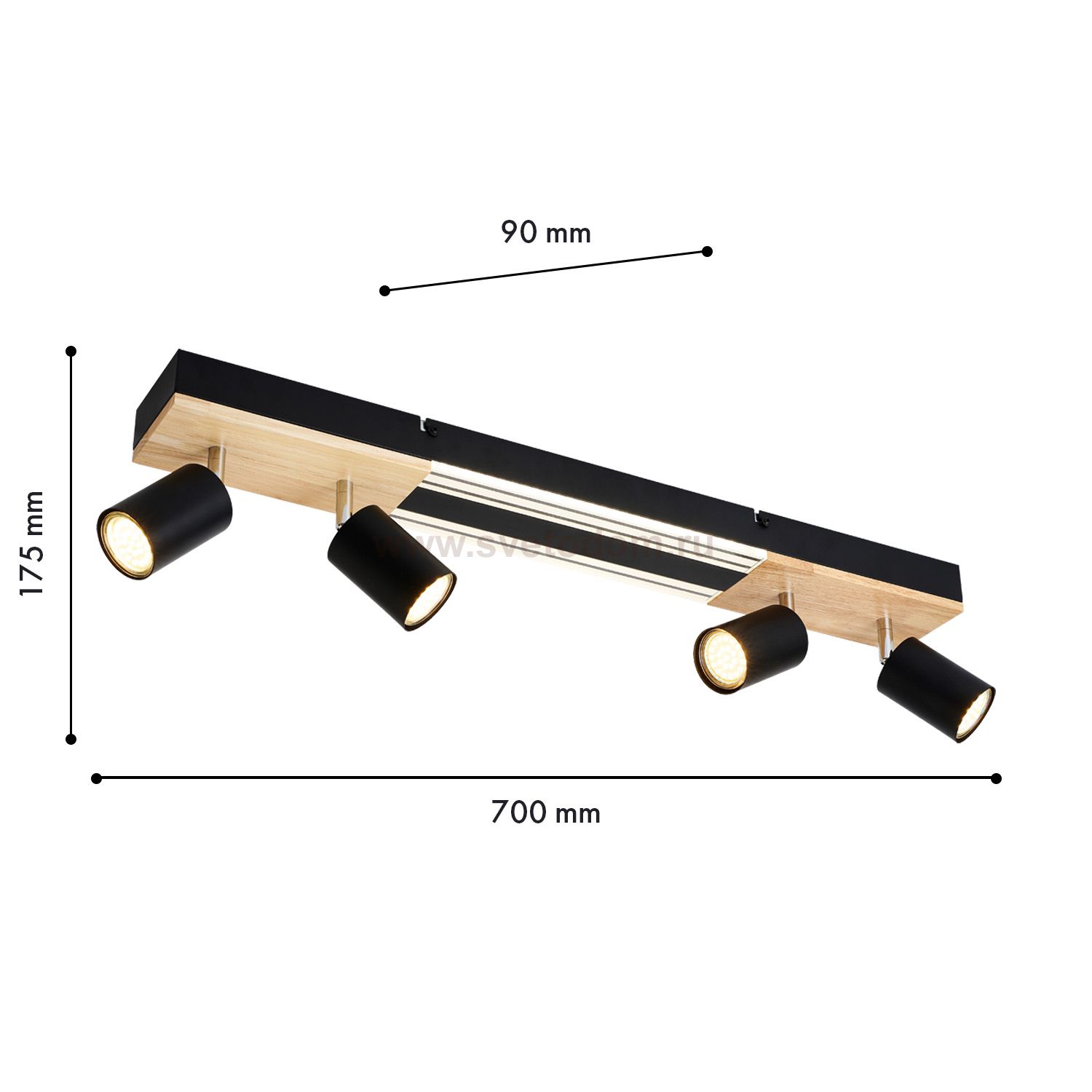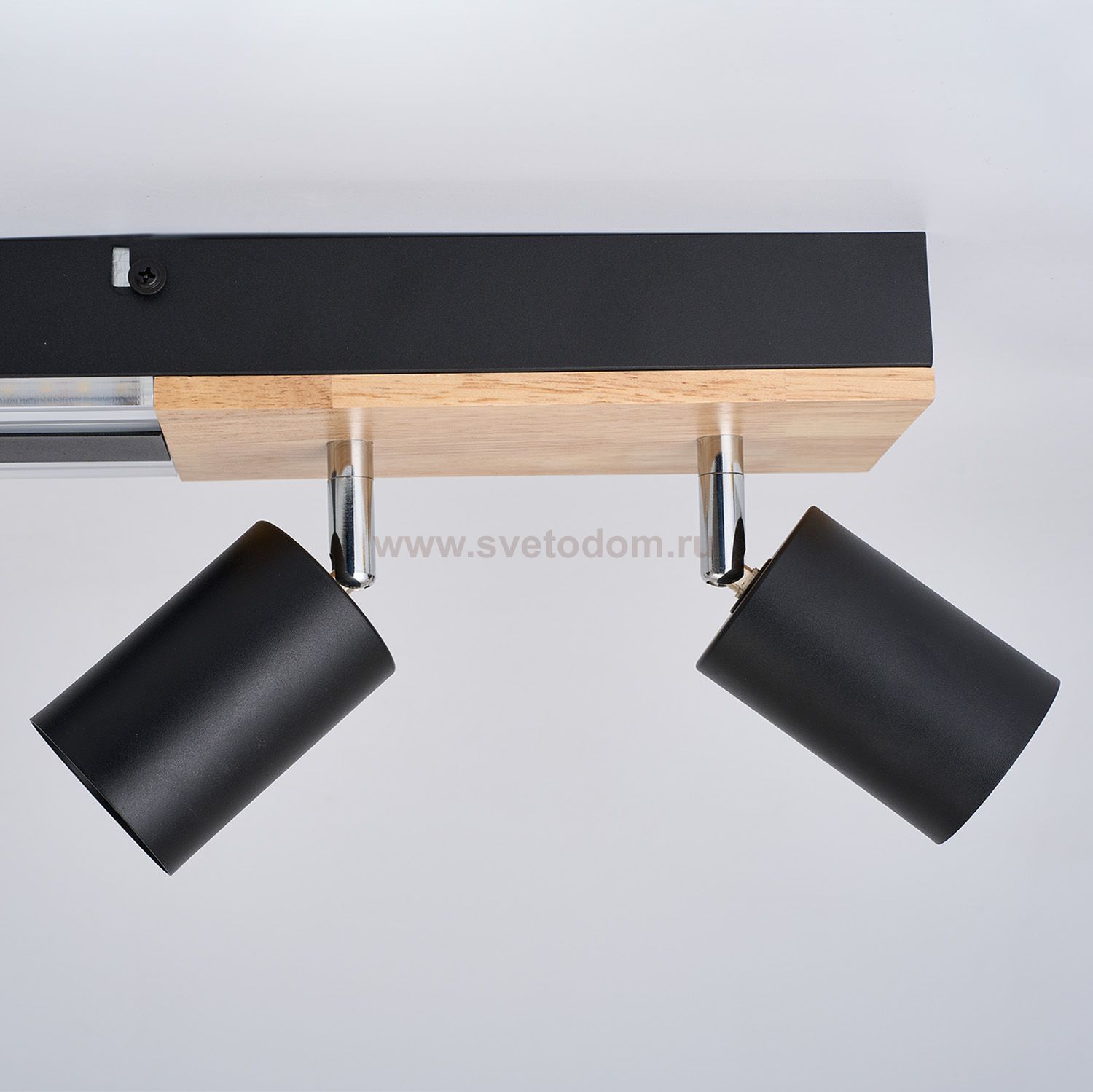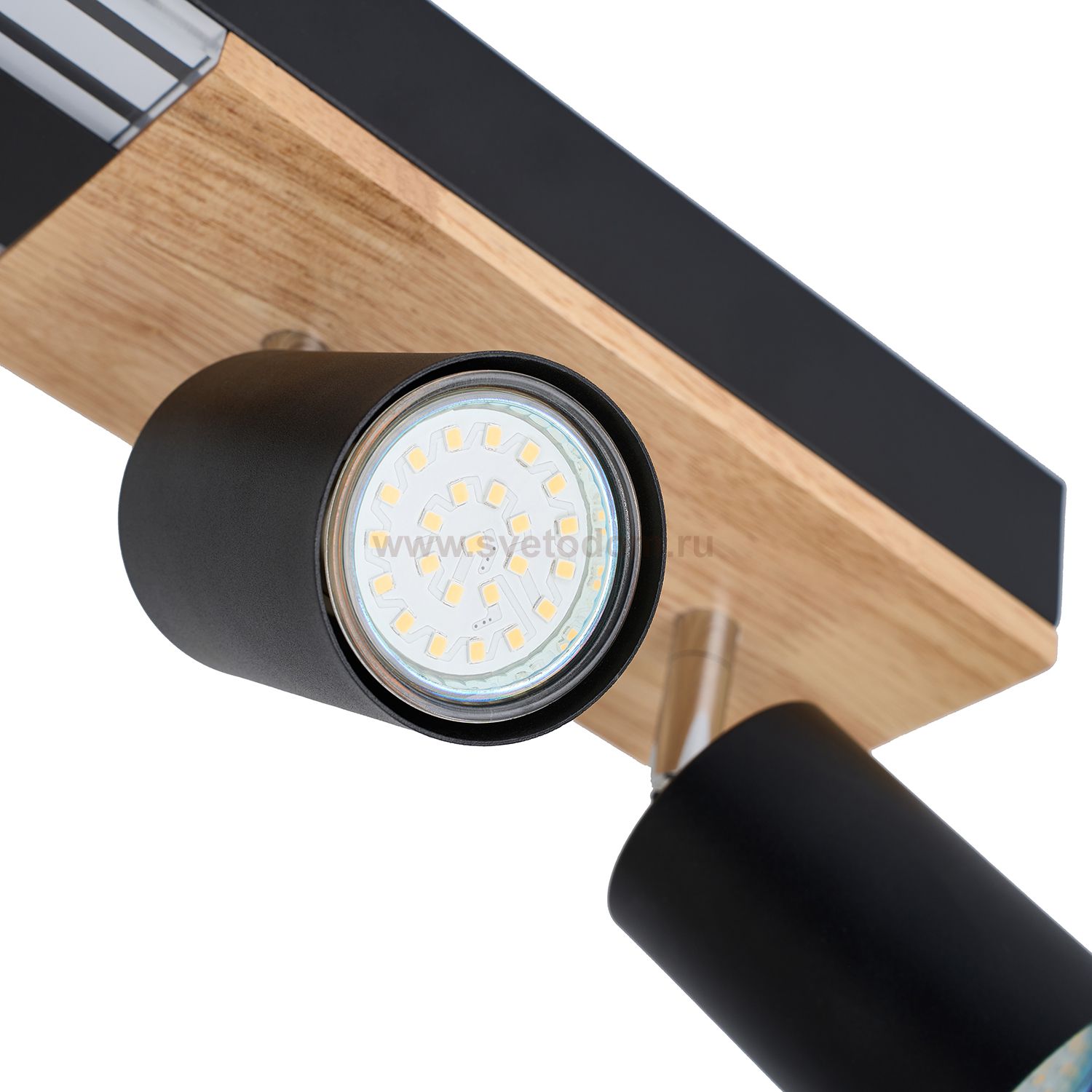 Декоративная вставка из МДФ с фактурой дерева на основании светильника, матовый черный каркас, LED-модуль, поворотные споты. Пульт дистанционного упра Серия