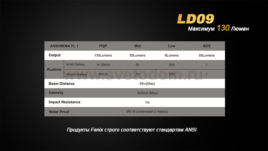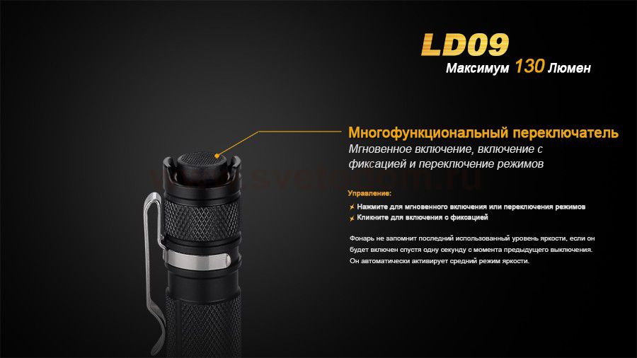 Модель ручного фонаря Fenix LD09 Cree XP-E2 LED пользуется широкой популярностью среди любителей загородного отдыха. Благодаря компактным размерам, он также нередко используется как осветительный прибор на каждый день, который всегда можно носить с собою в кармане или в качестве брелка. Длина корпуса осветительного прибора составляет 92 мм., а диаметр — 19 мм. Его электропитание осуществляется при помощи 1 батареи стандарта АА. Можно установить одноразовую алкалайновую батарейку или перезаряжаемый никель-магниевый аккумулятор. От этого источника питания Fenix LD09 Cree XP-E2 LED проработает до 50 часов с наиболее экономным освещением. Всего пользователю доступно 4 режима работы осветительного прибора: низкий — 8 люмен; средний — 55 люмен; высокий — 130 люмен; SOS — 55 люмен. Установить нужную яркость освещения легко при помощи торцевой кнопки, удобной для управления большим пальцем. При помощи этой же кнопки фонарь включается и выключается. На металлическом, защищенном от воды корпусе сделана ромбовидная накатка, которая препятствует выскальзыванию фонаря из рук. А прижимная клипса поможет зафиксировать положение осветительного прибора в кармане или сумке. Особенности: светодиод Cree XP-E2 со сроком работы более 50 000 часов; работа в 4 режимах (3 уровня яркости и режим SOS); диапазон мощности света от 8 до 130 люмен; удобная торцевая кнопка управления; система цифровой стабилизации тока; работа от 1 «пальчиковой» батареи; до 50 часов работы от 1 заряда; надежная оболочка из авиационного алюминия.