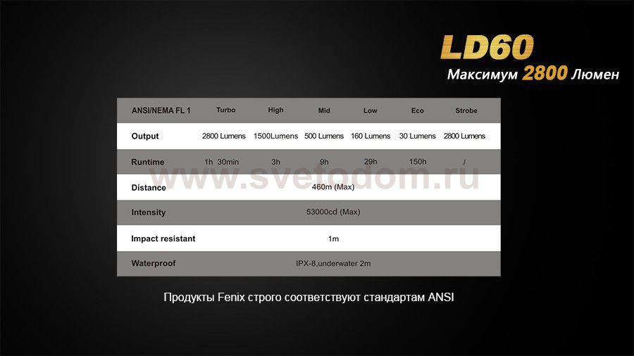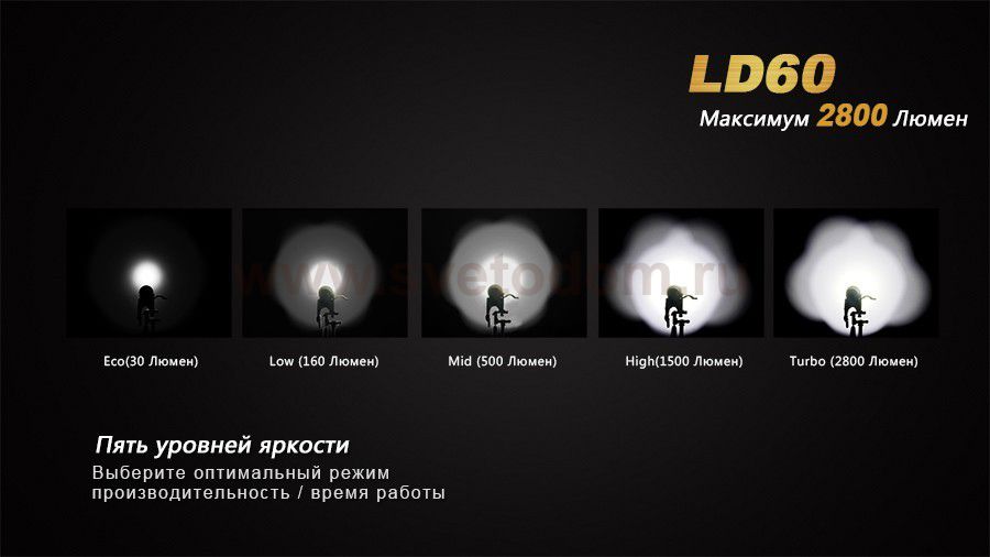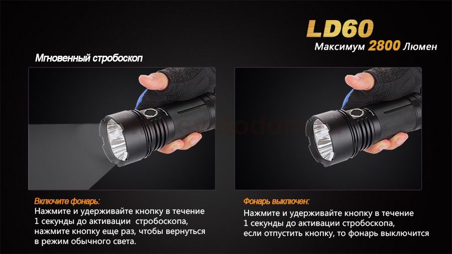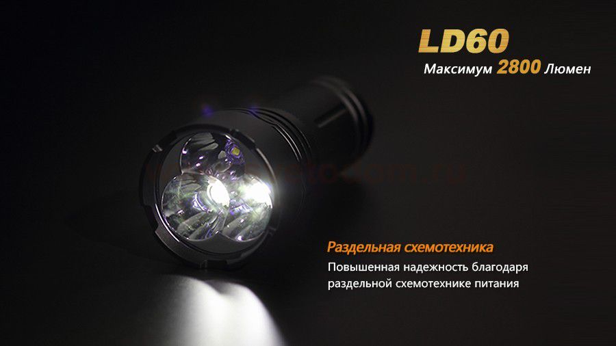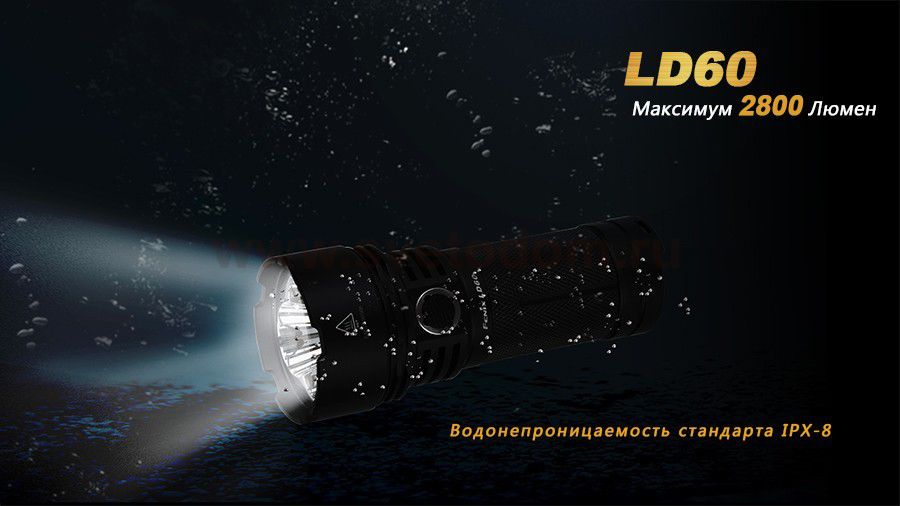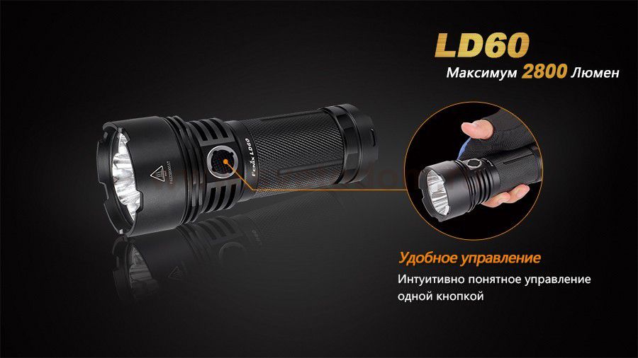 Фонарь Fenix LD60 относится к осветительным приборам широкого назначения. Это мощное и надежное устройство с компактным дизайном и простым управлением при помощи 1 кнопки в головной части корпуса. Яркий свет в данной модели обеспечивают сразу 3 светодиода последнего поколения CREE XM-L2 LEDs. Запас прочности каждого из них составляет 50 000 бесперебойной работы. Для максимальной надежности осветительного прибора, схемотехника светодиодов раздельная. Поэтому они могут работать как все одновременно, так и в случае, если 1 или 2 из них выйдут из строя. Наибольший возможный для Fenix LD60 показатель яркости — 2800 люмен. Фонарь можно включить в 1 из 4 стандартных режимах яркости, а также режимах турбо и стробоскоп. Технические характеристики его работы такие: Turbo: 2800 люмен / 1,5 часа; High: 1500 люмен / 3 часа; Mid: 500 люмен / 9 часов; Low: 160 люмен / 29 часов; Eco: 30 люмен / 150 часов; Strobe: 2800 люмен. Для работы осветительного прибора потребуется комплект из 3 аккумуляторов 18650 или 6 литиевых батарей CR123A. Последние будут предпочтительнее в холодное время года, поскольку у них практически отсутствует эффект саморазряда на морозе. Если вставить в батарейный отсек не все элементы питания, можно использовать только отдельные светодиоды фонаря. Кроме того у Fenix LD60 реализованы механизмы защиты от перегрева, установки батарей с неправильной полярностью, цифровая стабилизация яркости света, а также интеллектуальная система запоминания режимов яркости. При высокой мощности фонаря, его габариты достаточно компактны. Диаметр корпуса равен 46 мм, диаметр головы — 63 мм, длина устройства — 155 мм. Изготовлен корпус из прочного анодированного сплава авиационного алюминия с высшей степенью защиты от влаги — IPX-8. Особенности: 3 встроенных светодиода CREE XM-L2 LEDs с рабочим запасом более 50 000 часов; максимальная мощность светового потока достигает 2800 люмен; раздельная схемотехника; управление при помощи 1 кнопки; водонепроницаемость в соответствии со стандартом IPX-8; корпус из авиационного алюминия.