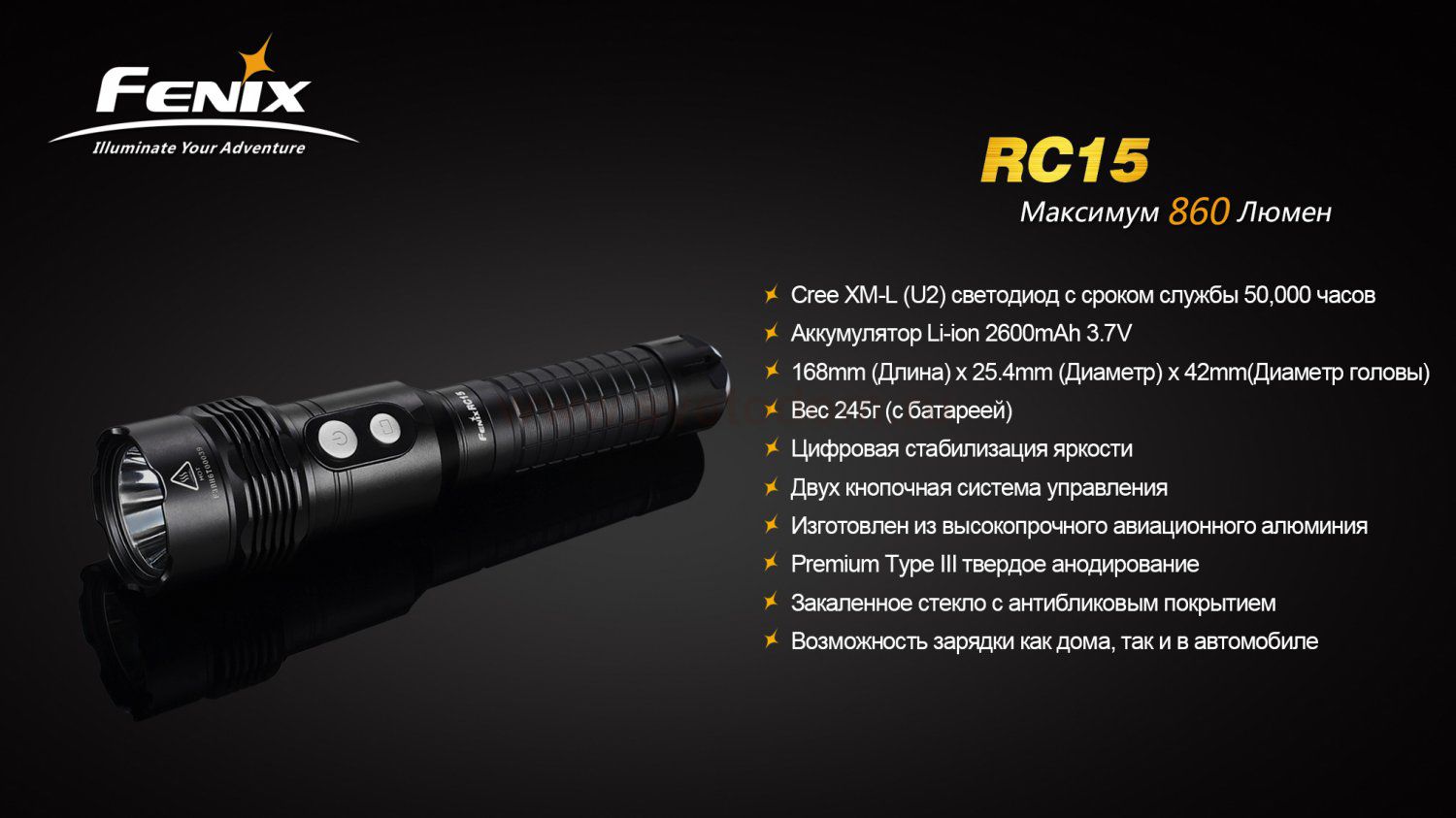 Fenix RC15 - современный поисковый фонарь, который можно заряжать дома и в машине, не извлекая аккумулятор. Работает фонарь на фирменном аккумуляторе Fenix Li-ion 3.7 В 2600 мАч, который идет в комплекте поставки. Fenix RC15 компактный и надежный поисковый фонарь с максимальной яркостью - 860 люменов. Максимальное время непрерывной работы - 100 часов. Фонарь освещает рекордное расстояние - 284 метра. Имеет 4 режима яркости для комфорта при использовании фонаря в различных условиях, а также режим стробоскопа и возможность послать сигнал SOS. Две кнопки: включения и смены режимов находятся в головной части для максимально удобного управления. При компактных размерах - фонарь Fenix RC15 отличается высокой прочностью и надежностью. Как и все фонари Fenix, он изготовлен из авиационного алюминия с защитным покрытием (анодирование III степени) - его корпус и стекло не боится падений и любых других повреждений в экстремальных обстоятельствах.