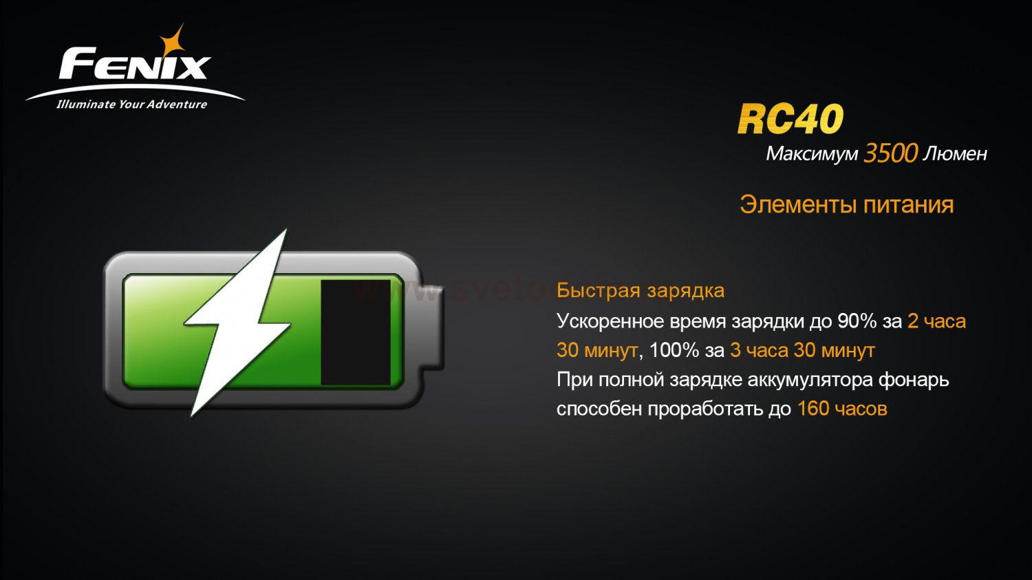 Fenix RC40 – самый мощный среди фонарей Fenix, при этом фонарь имеет компактный размер и удобство в управлении. Фонарь работает на фирменном аккумуляторе Fenix 7800mAh / 7.4V. Выносливый фонарь может непрерывно работать - 160 часов. С новым Fenix RC40 вы сможете осветить огромную территорию. Его дальность составляет 710 метров. Имеет 5 сбалансированных режимов яркости и режим стробоскопа. Fenix RC40 отличается высокой прочностью и надежностью. Как и все фонари Fenix, он изготовлен из авиационного алюминия с защитным покрытием (анодирование III степени) - его корпус и стекло не боится падений и любых других повреждений, что обеспечивает прочность и надежность фонаря при любых обстоятельствах. Благодаря уникальной конструкции, фонарь соответствует стандарту водонепроницаемости IPX-8 (погружение до 2 метров). Сверхмощный фонарь незаменим, когда необходимо осветить большую территорию, для поисковых и спасательных работ. Комплект поставки включает аккумулятор и все необходимые аксессуары.