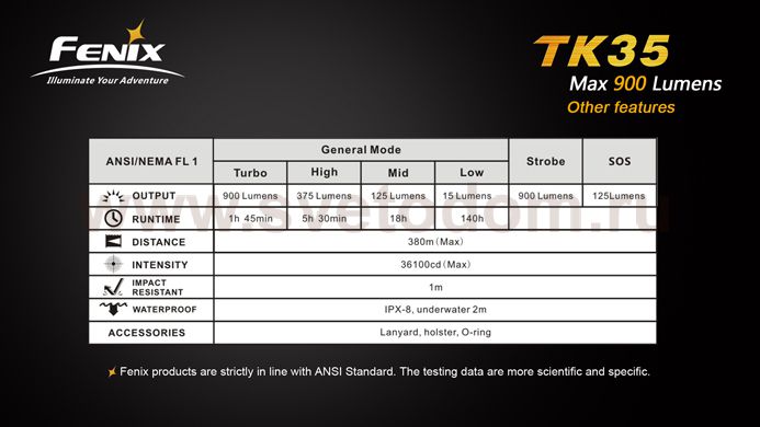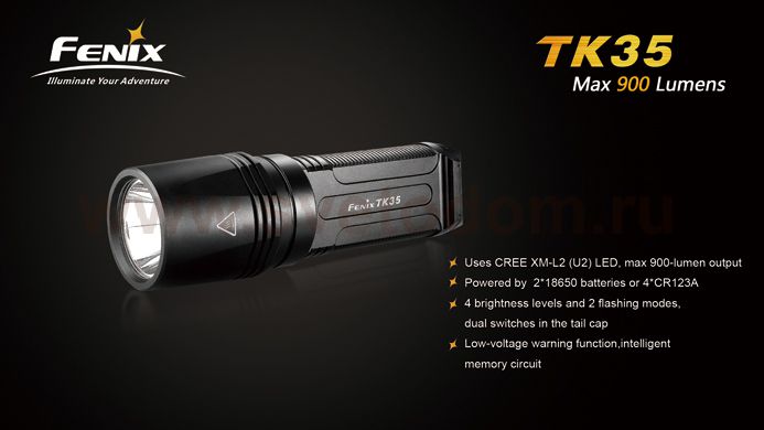 Fenix TK35 - мощный и при этом компактный фонарь. Оригинальный дизайн корпуса обеспечивает максимальное удобство и многофункциональность фонаря. Работает фонарь на стойких к низким температурам литиевых аккумуляторах CR123A или (на более емких) - 18650. Fenix TK35 - сверхмощный фонарь, его максимальная яркость - 900 люменов. Он позволит вам освещать растояние до 340 метров. Фонарь может непрерывно работать в течении 130 часов в минимальном режиме без замены элементов питания. Компактный и практичный фонарь изготовлен из авиационного алюминия с антиабразивным покрытием (анодирование III степени) - его корпус не боится падений и любых повреждений.А благодаря особенностям конструкции, фонарь не скатывается на гладкой пологой поверхности. Кроме того, как и все фонари Fenix, Fenix TK35 соответствует стандарту водонепроницаемости IPX-8 - фонарь выдерживает погружение в воду до 2 метров. TK35 - лучший фонарь для поисковых и спасательных работ, а также для охоты и активного отдыха. Особенности Fenix TK35: Усовершенствованный светодиод Cree XM-L2 (U2), с ресурсом более 50.000 часов; Включение и переключение режимов отдельными кнопками в хвостовой части; Питание фонаря от 4-х аккумуляторов CR123A либо 2-х - 18650; Защита от неправильной установки элементов питания; Поддержание постоянной яркости с помощью специального контроллера; Сверхпрочное стекло с антибликовым покрытием. |