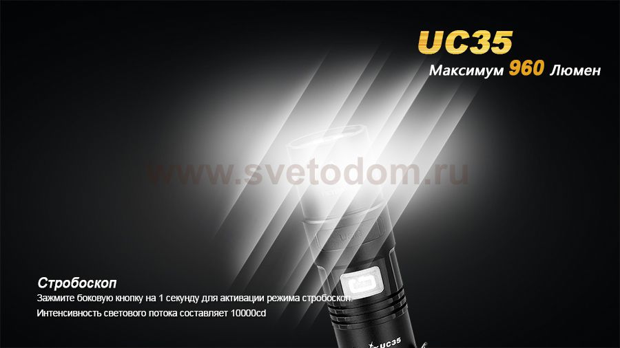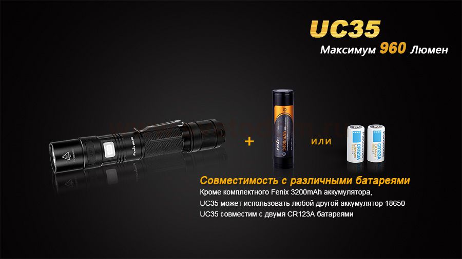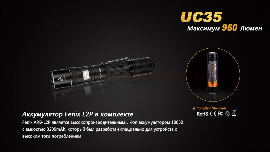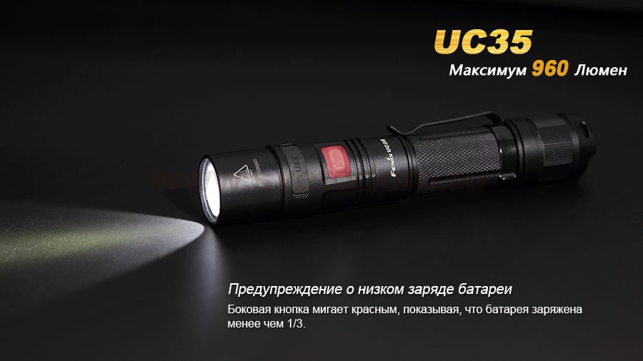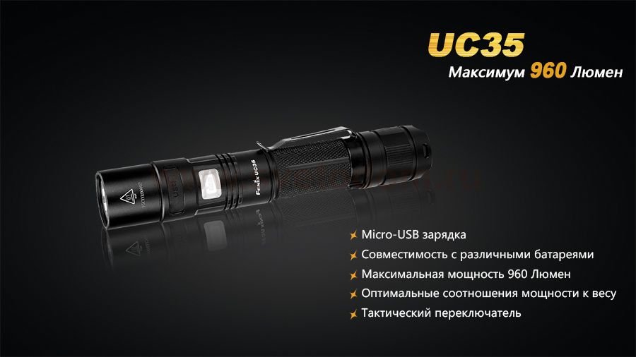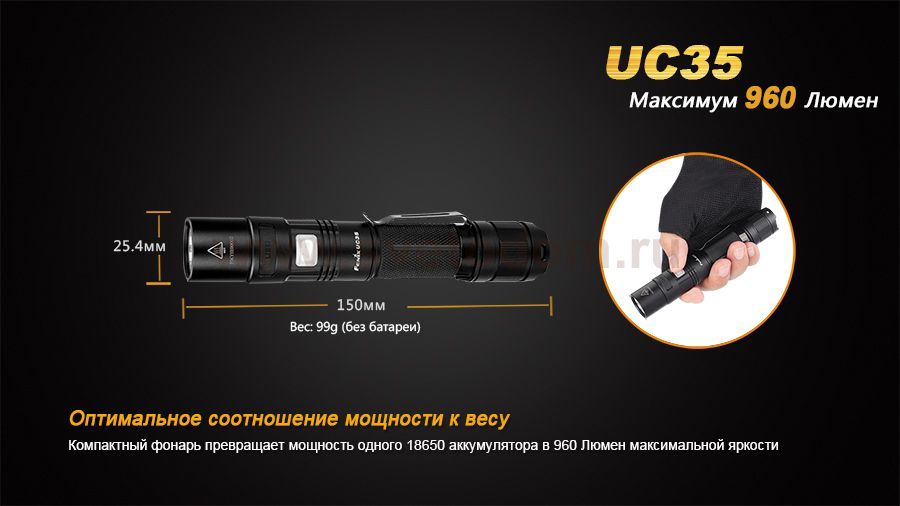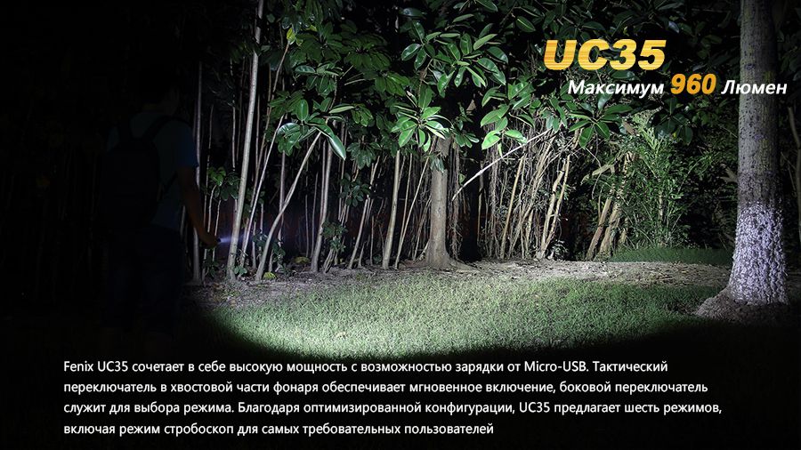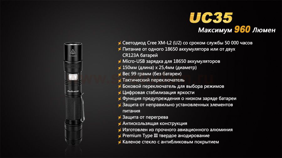 Проектируя фонарь Fenix UC35, целая команда инженеров работала над тем, чтобы создать оптимальный вариант для эксплуатации в походных условиях. Отзывы покупателей говорят о том, что это им вполне удалось. В осветительный прибор интегрирован производительный светодиод Cree XM-L2 (U2), который способен светить в течение 50 000 часов. Максимальная мощность светового потока в этой модели — 960 люмен. Кроме наиболее яркого Turbo режима, пользователям доступны еще 4 уровня яркости света (High 480 люмен – Mid 180 люмен – Low 50 люмен – Eco 15 люмен). В дополнение к ним предусмотрен режим Strobe, с помощью которого можно подавать световые сигналы. Для управления работой Fenix UC35 предназначены два переключателя. В хвостовой части расположена кнопка мгновенного включения и выключения без фиксации. А боковой переключатель отвечает за выбор нужного режима. В том числе, если удерживать ее нажатой в течение 1 с, активируется режим стробоскоп с интенсивностью светового потока 10 000 Кд. В качестве элементов питания в батарейный отсек фонаря можно установить 2 батареи CR123A или же 1 аккумулятор 18650. Более того, после исчерпания заряда аккумулятор можно не только заменить на новый, но и подзарядить прямо в корпусе фонаря с помощью Micro-USB порта. Производители постарались, чтобы даже в экстремальных походных условиях, фонарь Fenix UC35 продолжал работать надежно и эффективно. В систему осветительного прибора встроены механизмы защиты от переполюсовки батарей, цифровой стабилизации яркости света, предупреждения о скором исчерпании заряда. Также в модели Fenix UC35 реализована система интеллектуальной памяти для последнего выбранного режима. Внешняя оболочка фонаря также служит серьезной защитой для всех систем. Она представляет собою прочный корпус из авиационного алюминия, который способен выдержать серьезные нагрузки. Кроме того, Fenix UC35 может работать под дождем и даже во время погружения на глубину до 2 м. Его водонепроницаемость соответствует международному стандарту ANSI IPX-8. Особенности: современный американский светодиод Cree XM-L2 (U2); 5 уровней яркости и тактический режим стробоскоп; интеллектуальная система запоминания уровня яркости; работа с элементами питания типов 18650 и CR123A; возможность заряжать 18650 аккумулятор через Micro-USB; функция предупреждения о низком заряде; корпус из авиационного алюминия. Важная информация: Фонарь заряжается только во включенном состоянии. При этом он не светит, а индикацией заряда служит светящаяся кнопка переключения режимов. После окончания процесса заряда кнопка будет светиться зеленым. Если в процессе заряда отключить фонарь от зарядки, то он опять загорится. При разряде аккумулятора кнопка переключения режимов мигает красным. Перед использованием нужно вытянуть диэлектрический предохранитель, а то фонарь не будет гореть.