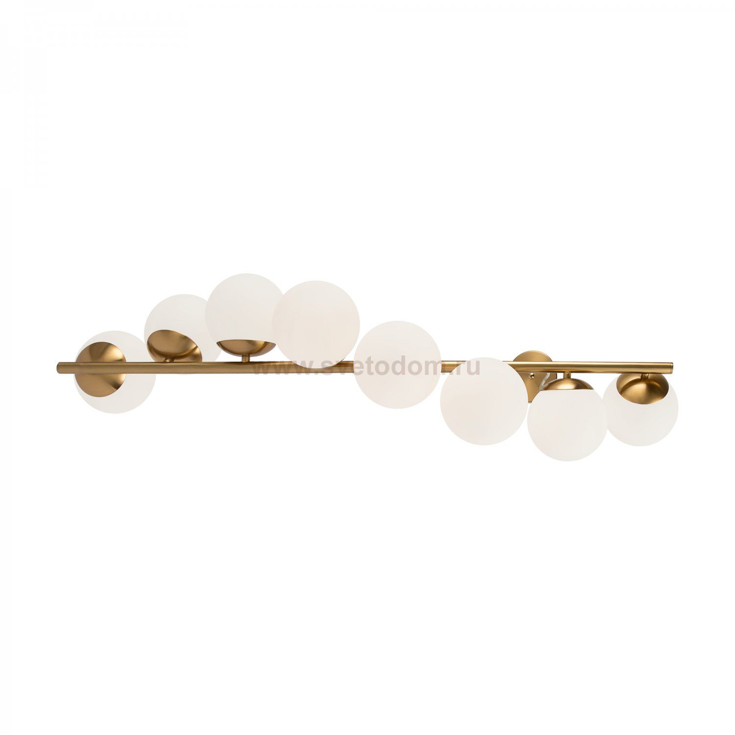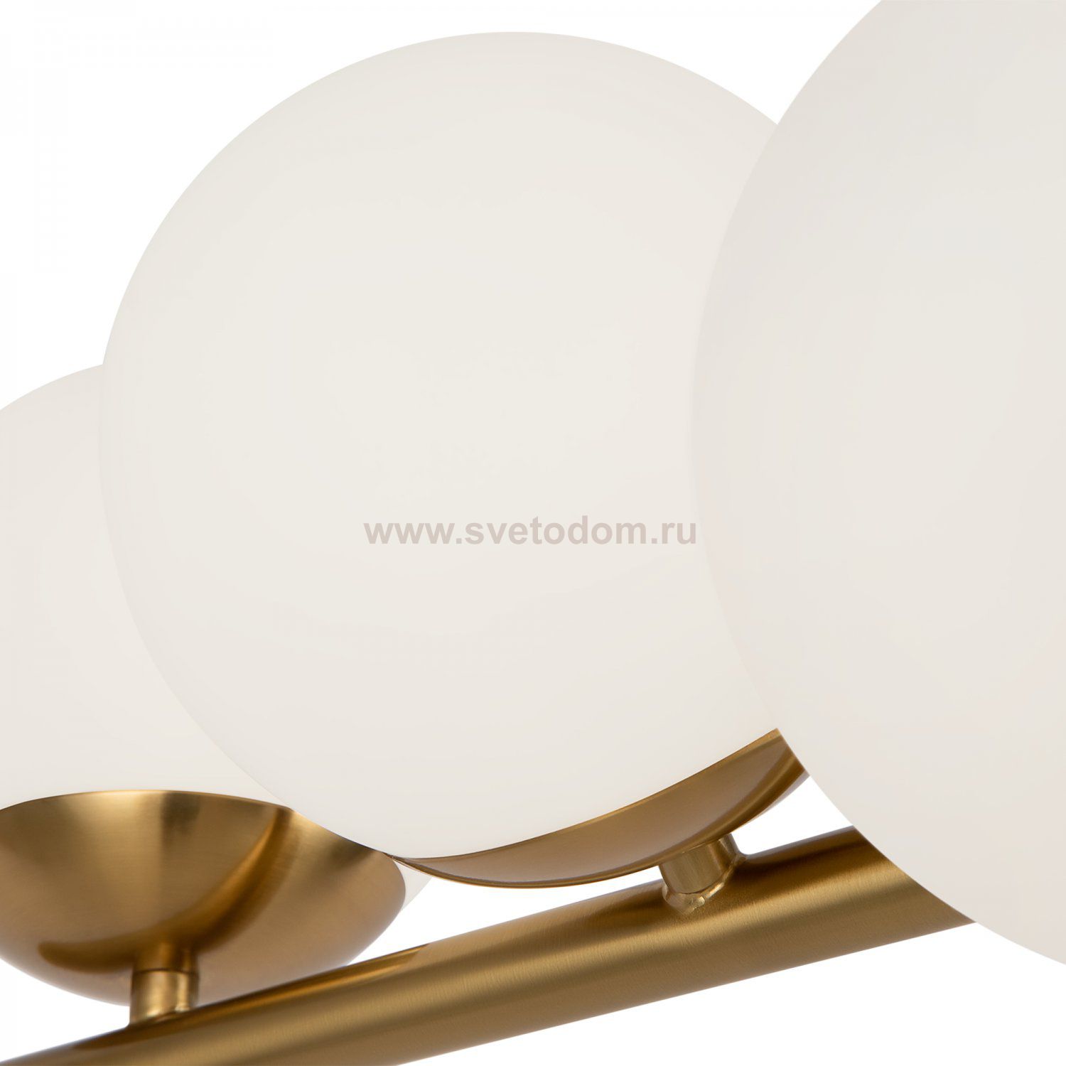 Металлическая арматура. Оттенок – латунь. Плафоны-сферы из матового стекла. Оригинальное конструктивное решение: плафоны размещены на горизонтальной или вертикальной планке. Источник света – лампа с цоколем Е27.