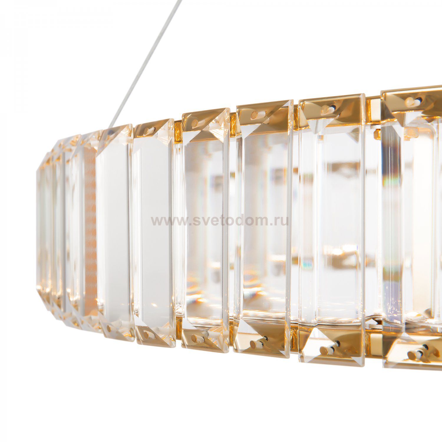 Металлическая арматура в цвете латунь и хром. Хрустальные декоративные кольца с геометричными гранями. LED-источник света. Регулировка цветовой температуры (3000-4000-5000K) и яркости 4G-dimming при помощи пульта (в комплекте).