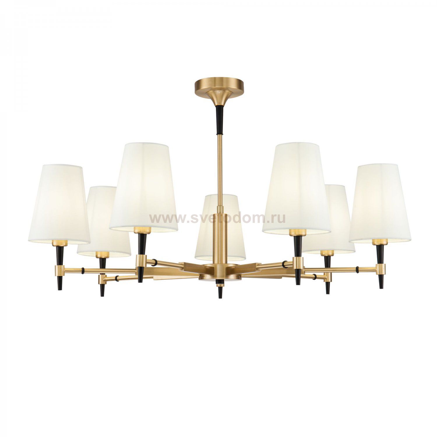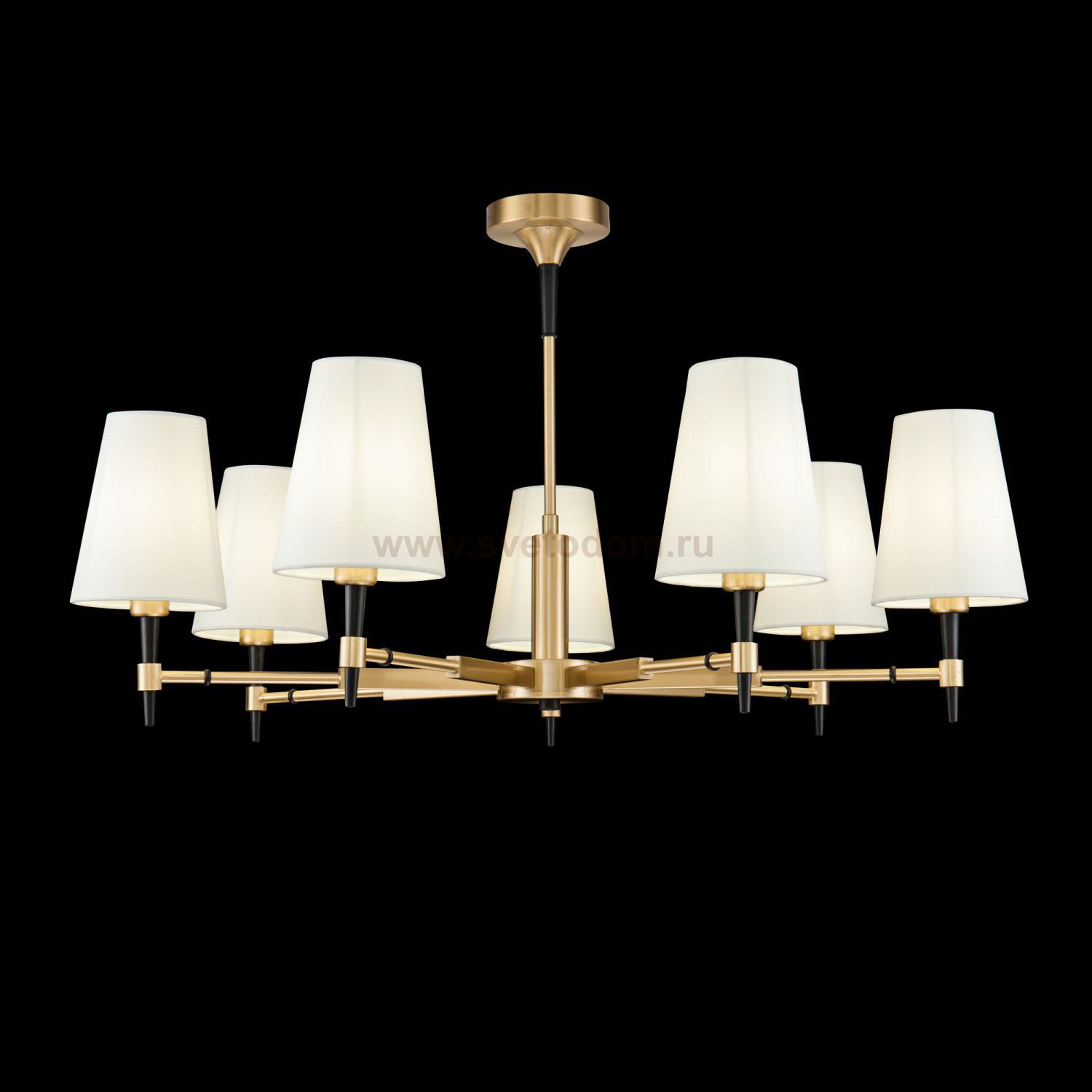 Металлическая арматура, гальванизация в цвет латуни. Часть элементов окрашена в черный цвет. Абажуры из белого текстиля, нанесенного на ПВХ. Источник света - лампа с цоколем Е14.