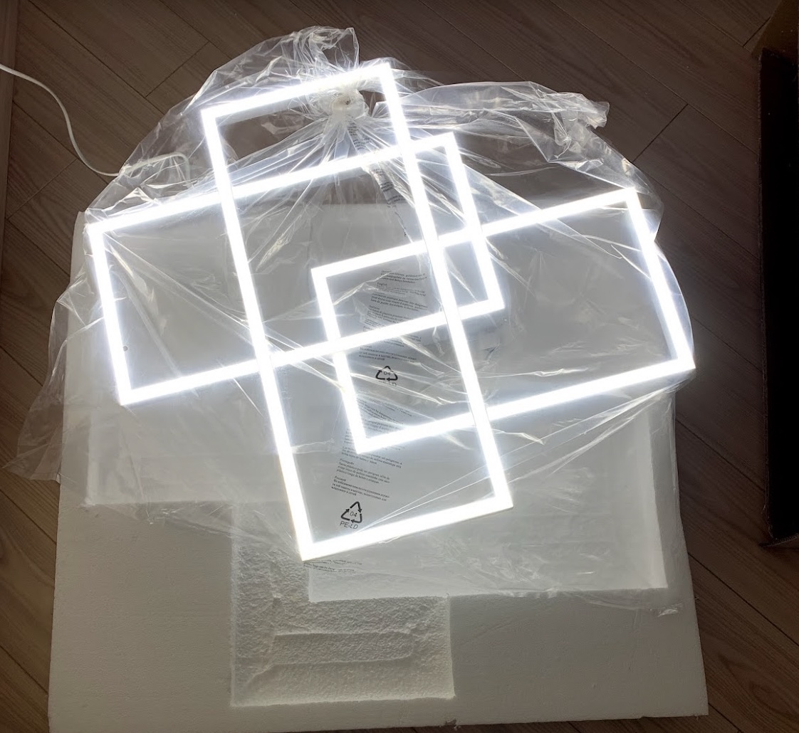 Металлическая арматура, оттенки — белый и черный. Матовый акрил скрывает интегрированные LED-источники. Геометричный дизайн: конструкция состоит из наложенных друг на друга прямоугольников.