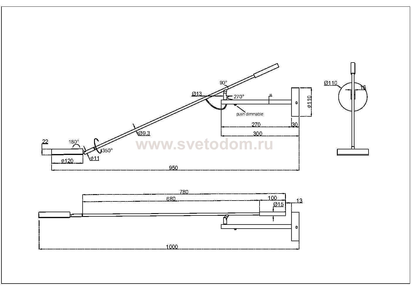 Плафоны и арматура из металла. Цвет рассеивателя — белый, арматура черная или белая. Конструкция предусматривает шарнирный механизм, позволяющий регулировать направление света и высоту светильников. Плафоны вращаются на 90 и 360° (в вертикальной и горизонтальной плоскостях). Угол рассеивания — 120 градусов. Тип света — рассеянный.