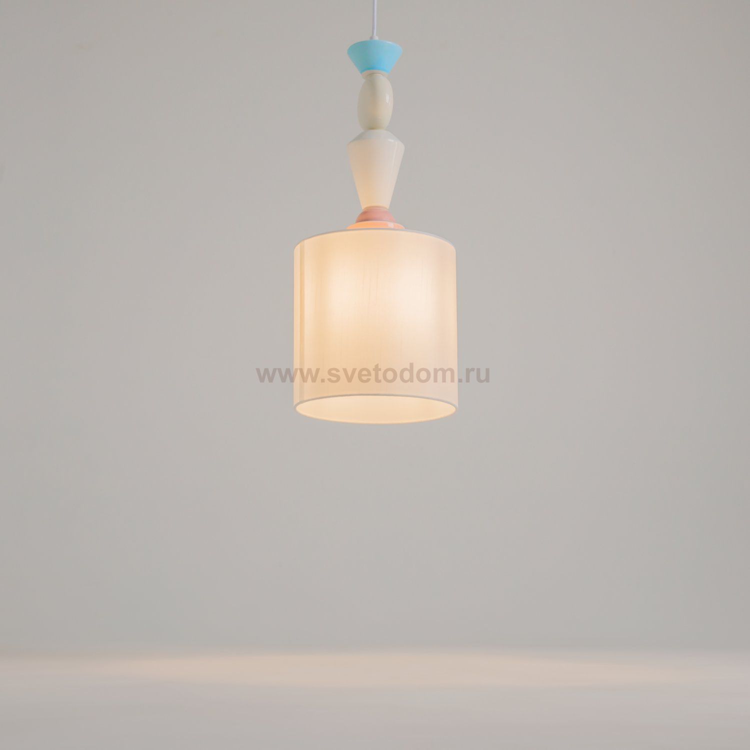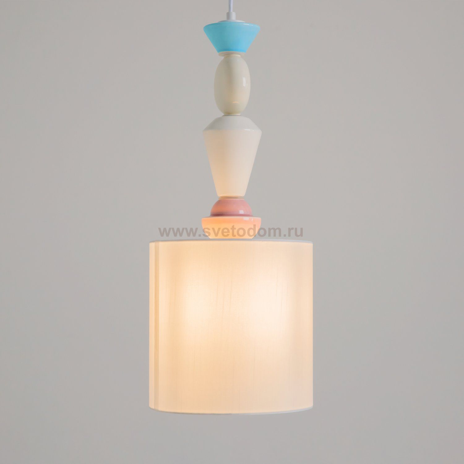 Арматура из металла, цвет - белый. Абажур выполнен из натуральной ткани, цветные декоративные элементы в пастельных тонах — из керамики. Белый абажур имеет классическую цилиндрическую форму, ткань дает мягкий рассеянный свет. Светильники комплектуются сменными лампами с цоколем Е27 (не входят в комплект). Провод подвесного светильника можно регулировать по длине. Декор напоминает стилистику крафтового искусства