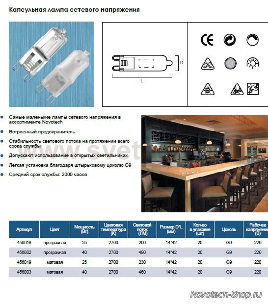 В интернет-магазине «Светодом» можно купить не только люстры и светильники, но и лампочки. В нашем каталоге представлены светодиодные, галогенные, энергосберегающие модели и лампы накаливания. В ассортименте имеются изделия разной мощности, поэтому у нас Вы сможете приобрести все необходимое для освещения. Лампа Novotech 456002 обеспечит отличное качество освещения. При покупке ознакомьтесь с параметрами в разделе «Характеристики», чтобы не ошибиться в выборе. Там же указано, для каких осветительных приборов Вы можете использовать лампу Novotech 456002Novotech 456002. Для оформления покупки воспользуйтесь «Корзиной». При наличии вопросов Вы можете позвонить нашим менеджерам по одному из контактных номеров. Мы доставляем заказы в Москву, Екатеринбург и другие города России.