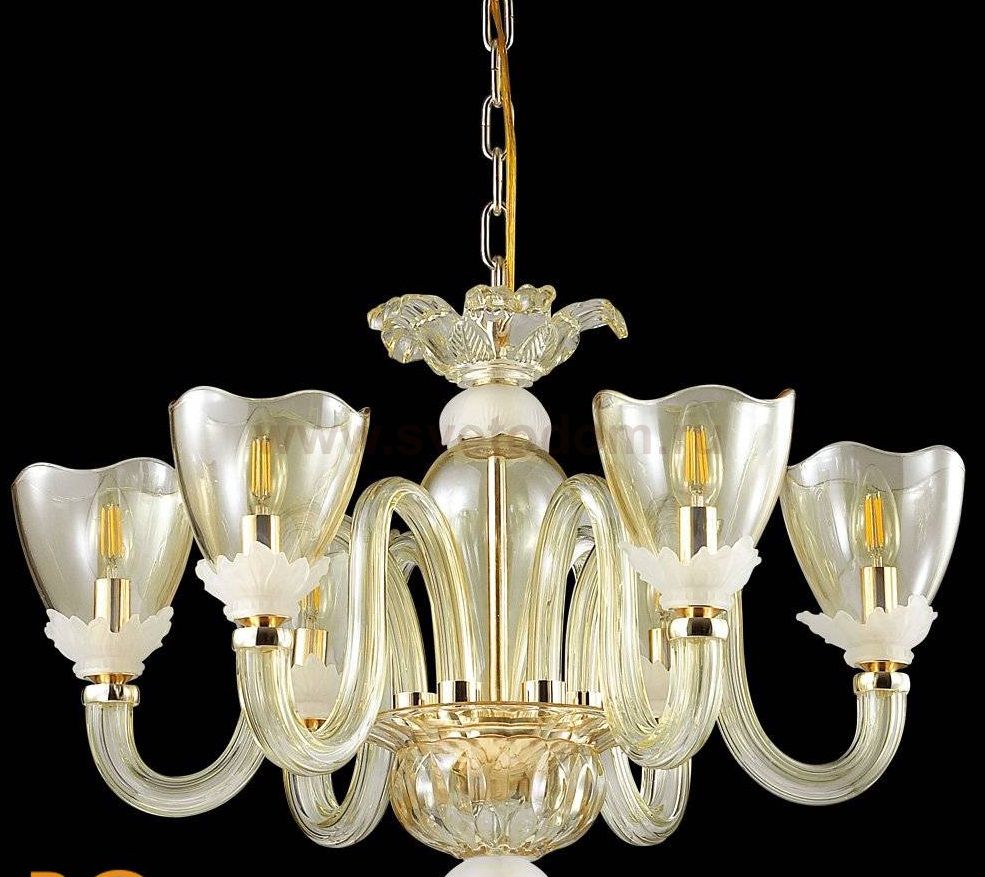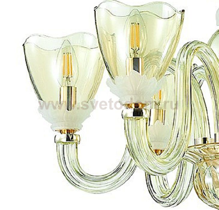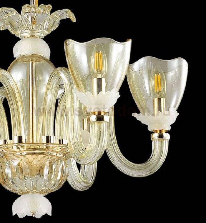 В люстре 4003 / 6 линии Floriana чудесным образом сочетаются золотая арматура, прозрачные стеклянные рожки и плафоны в красивом оттенке "шампань", выполненные в виде цветков и основание которых украшают матовые стеклянные элементы в нежном молочном оттенке. Благодаря прозрачности стеклянных элементов, люстра сморится легкой и воздушной, а игра света выглядит непередаваемо красиво. Цоколь E14. Мощность 6*40W. Нет ламп в комплекте.