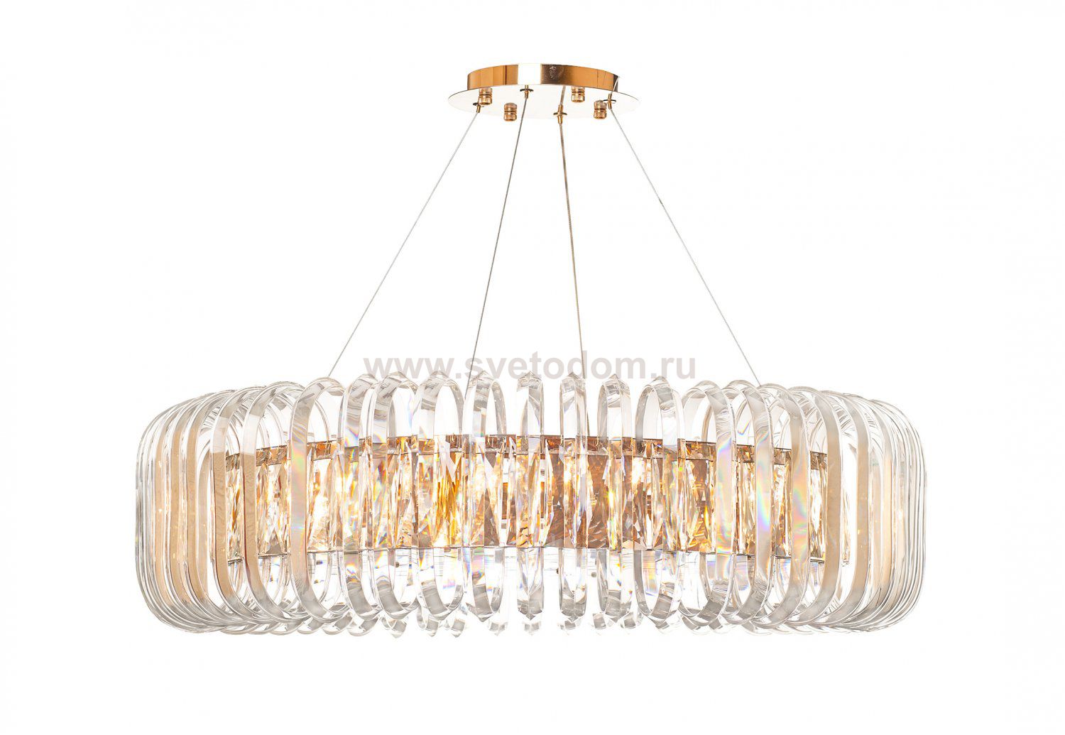 Люстра Glass Belt выполнена в оригинальном дизайне в виде тора, на основе металлического каркаса цвета Gold и изящно изогнутых тонких пластин из прозрачного стекла. Конструкция крепится к круглой потолочной планке при помощи тонких металлических нитей повышенной прочности