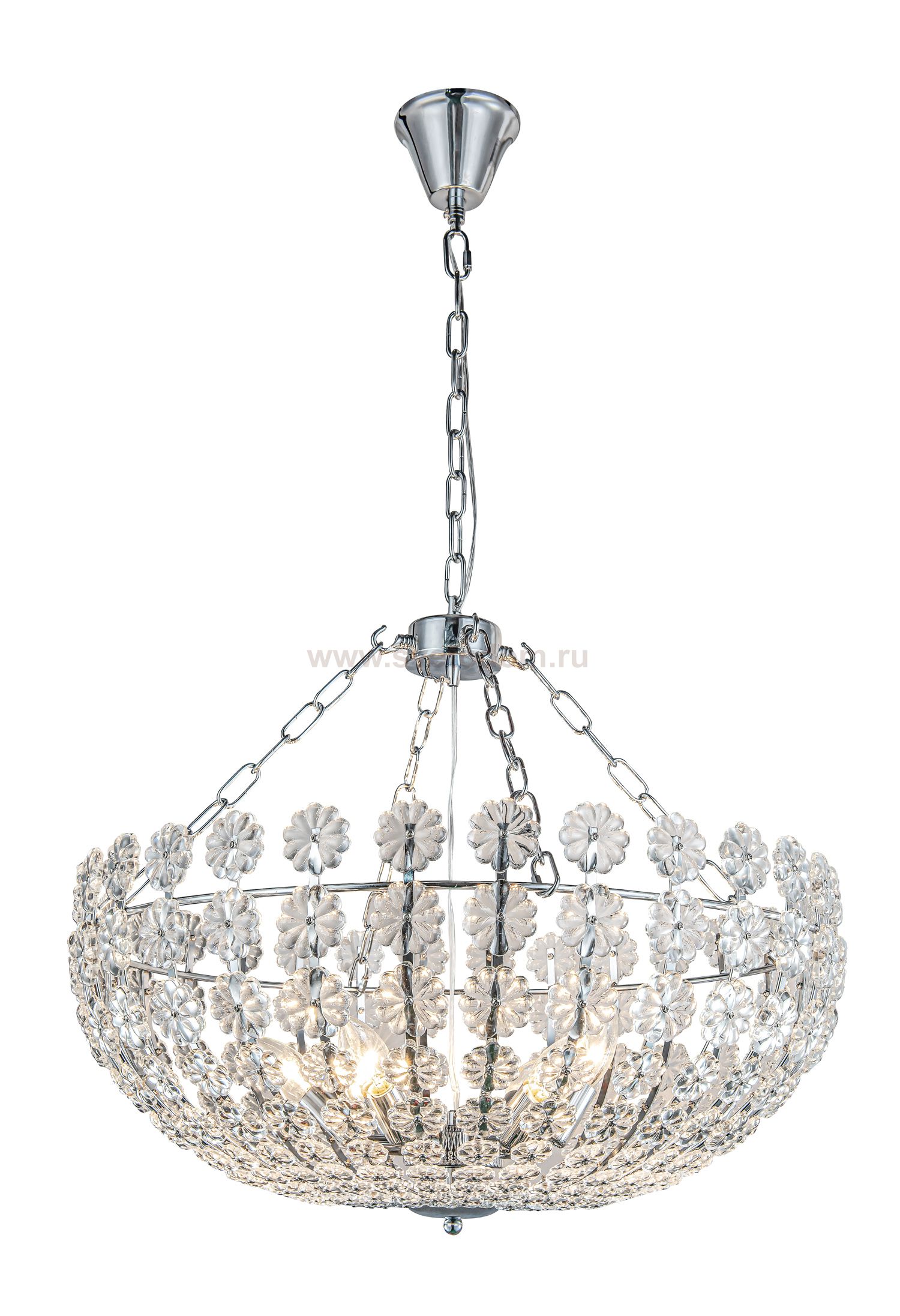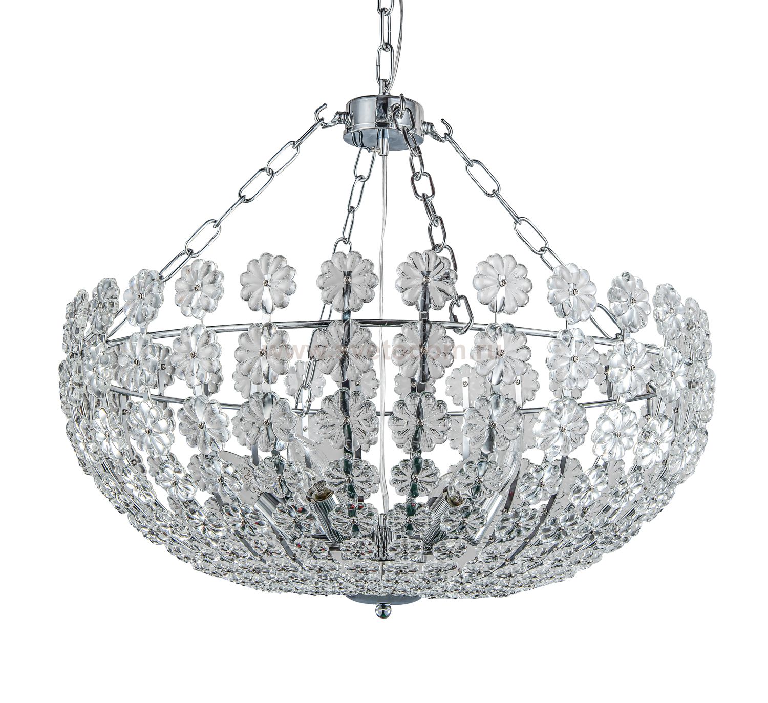 Шикарная люстра Cleo серебристого цвета, в виде чаши с ажурными стенками. Легкий полувоздушный каркас из хромированной проволоки покрыт сетью изящных цветков, отлитых из прозрачного стекла. Внутри чаши скрыты цоколи Е14 с лампочками, свет которых, проходя сквозь стеклянную преграду, частично преломляется и приглушается, с созданием необычных визуальных эффектов.
