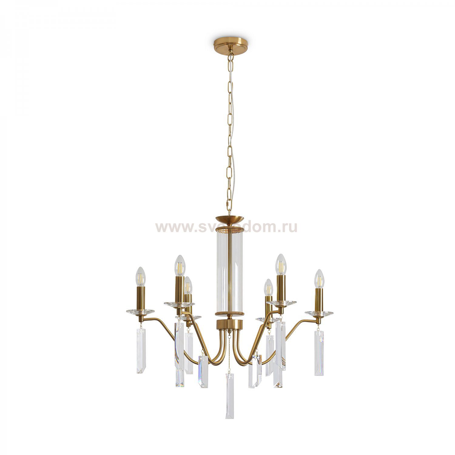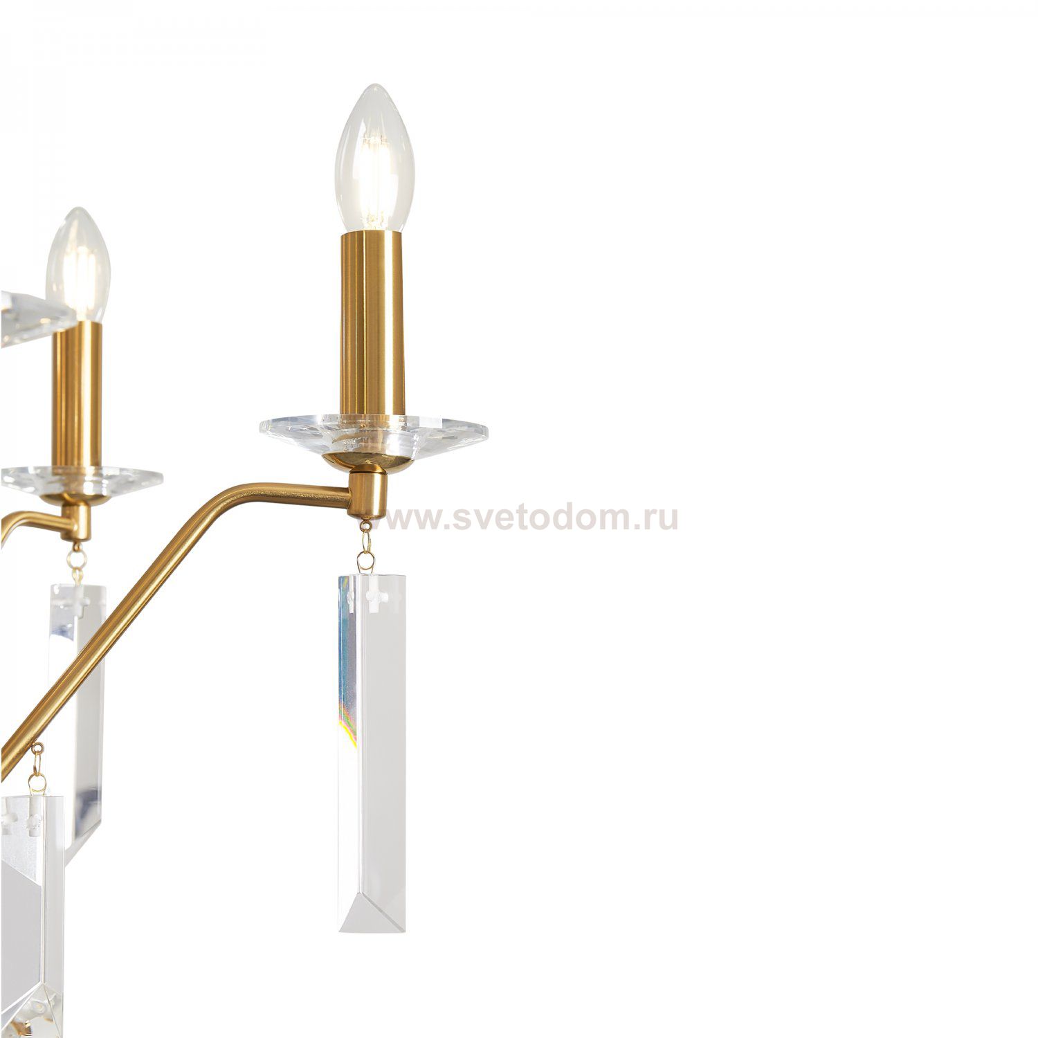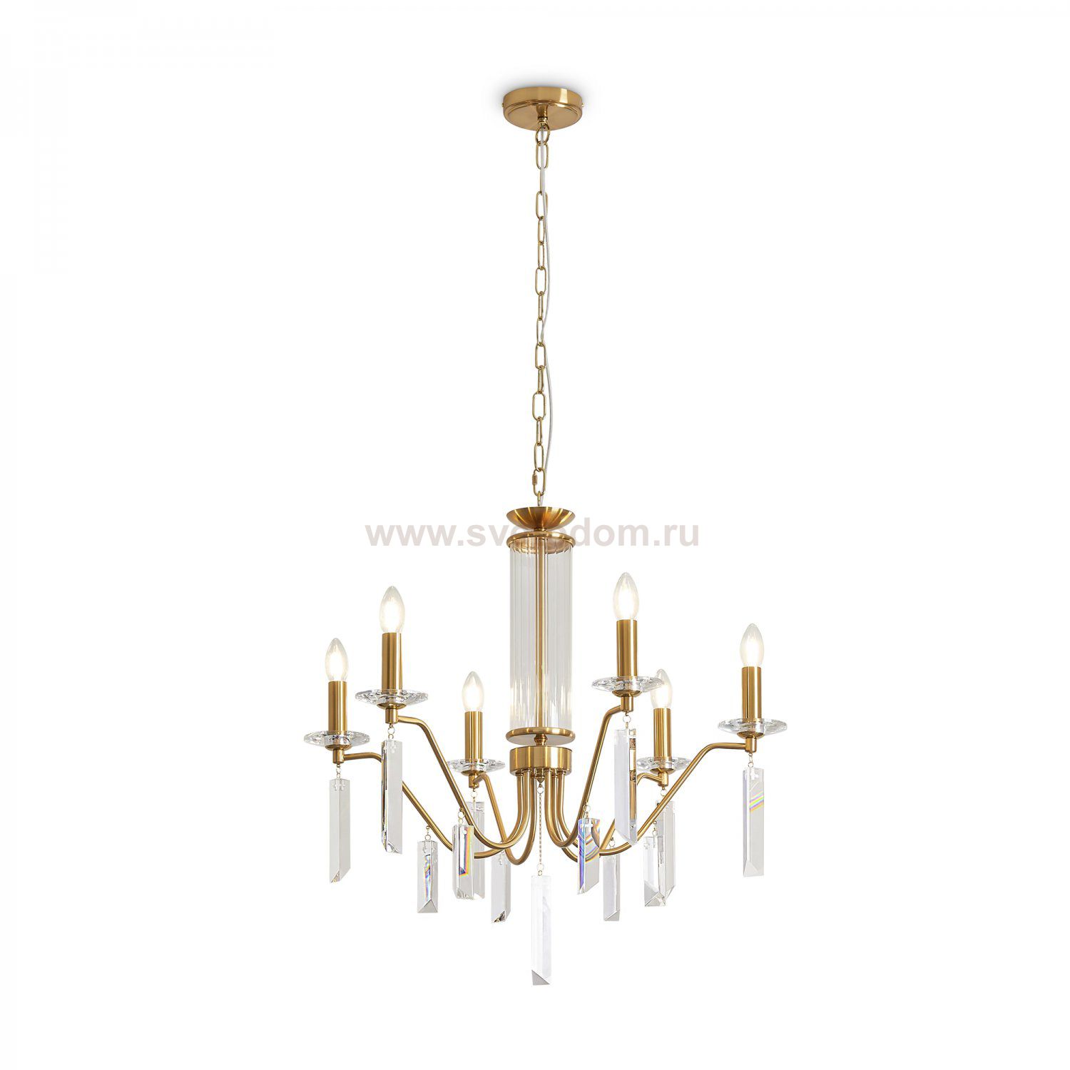 Материал арматуры — металл, цвет — никель или латунь. Подвесные светильники с цоколем E14. Доступны с пятью или шестью источниками света. Грани хрустальных подвесов создают эффект перелива радуги. Центральный декор из стеклянных трубок. Подходит для классических интерьеров.