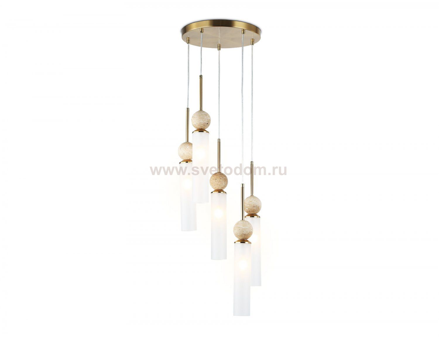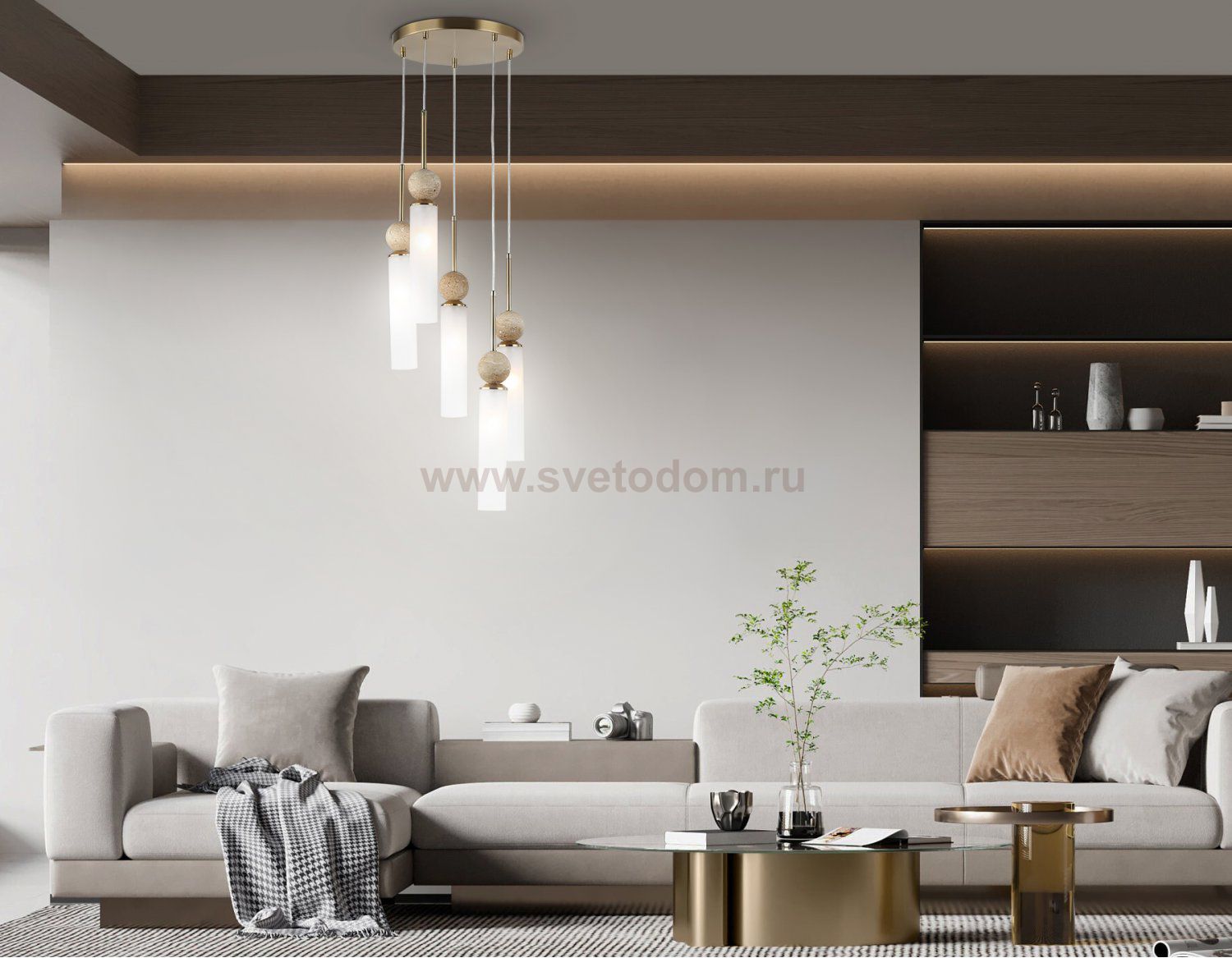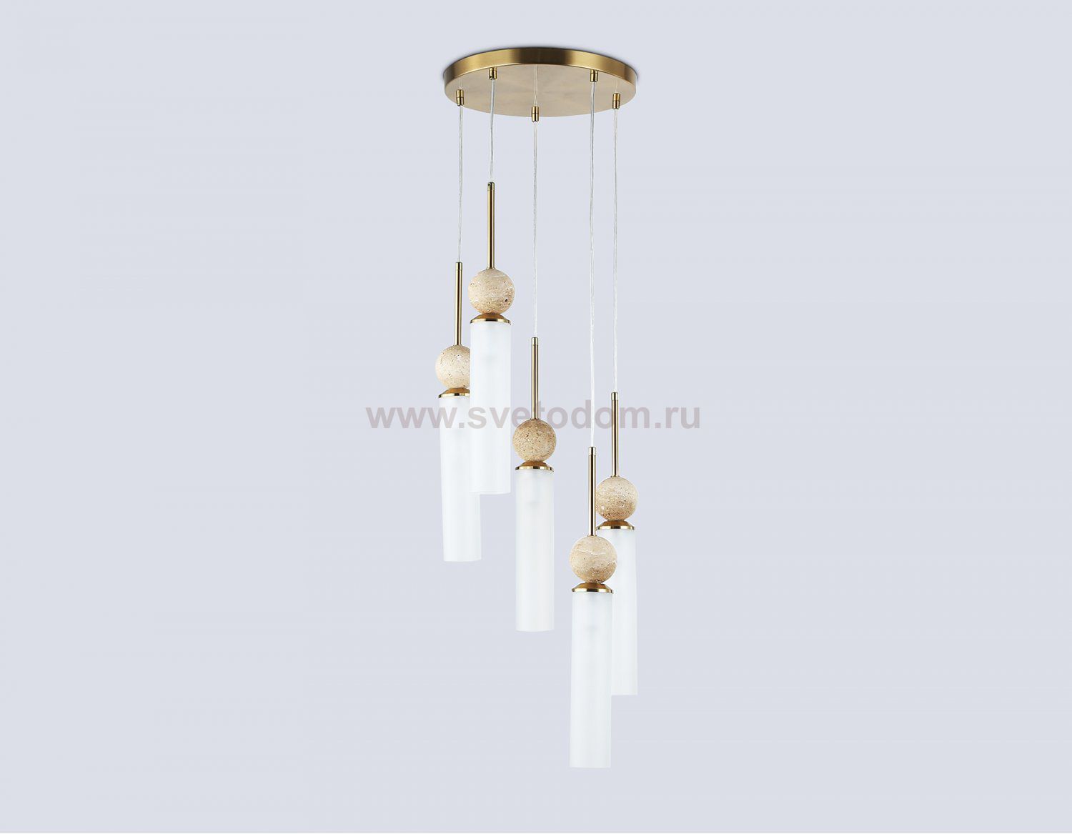 Подвесной светильник из коллекции HIGH LIGHT. Модель LH53259 представлена в современном стиле модерн. Светильник выполнен из металла в цвете латунь со стеклнным белым матовым плафоном, а также украшен мрамором песочного цвета. Имеет пять цоколей Е14. Светильник будет прекрасным дополнением в любом помещении.