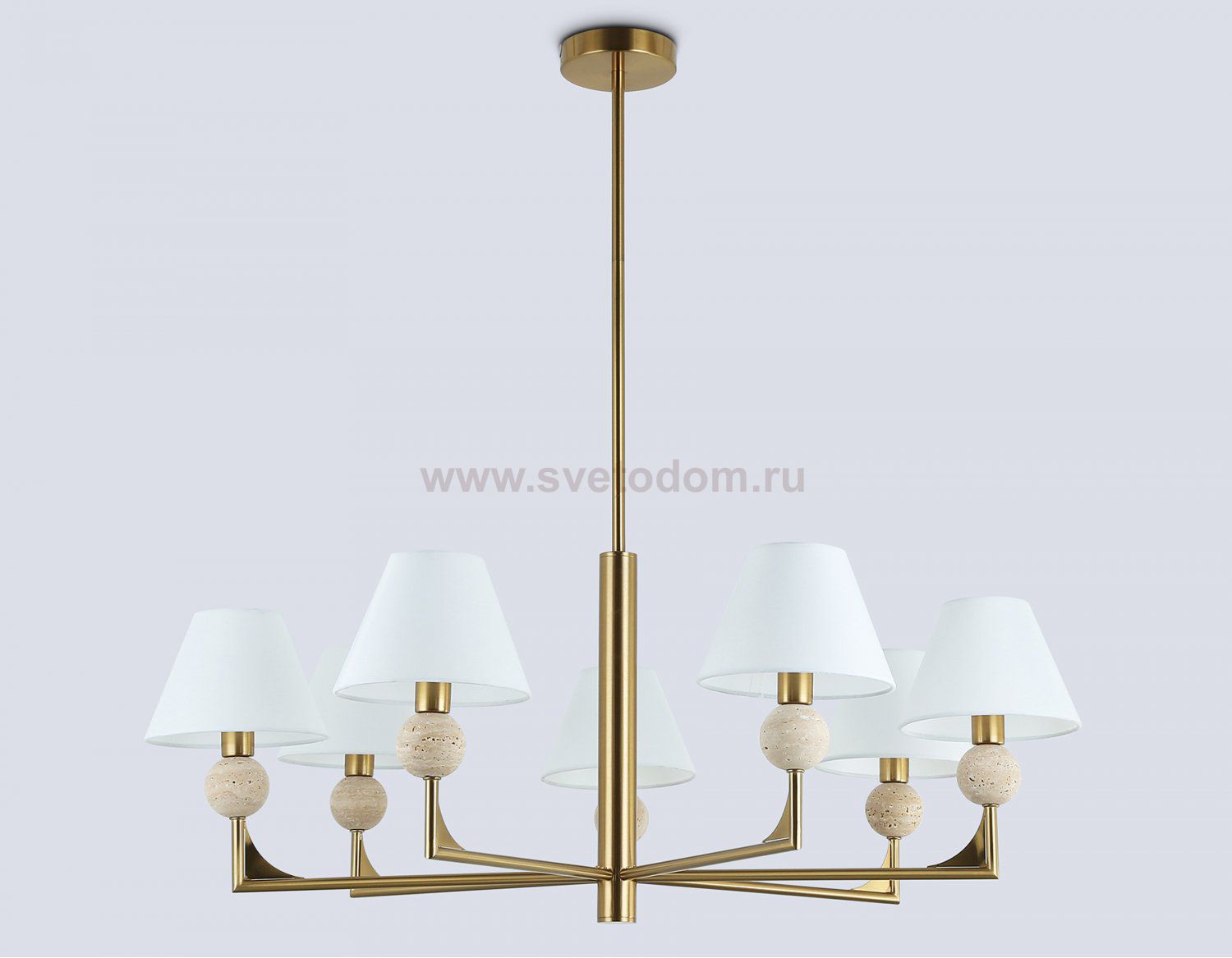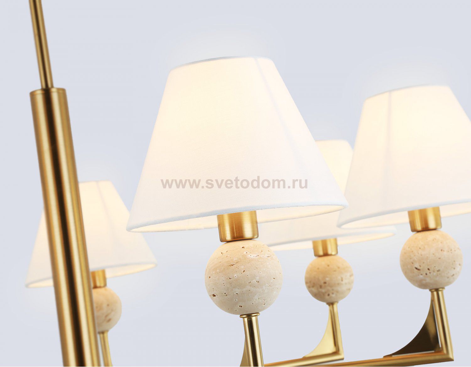 Подвесная люстра на штанге из коллекции HIGH LIGHT. Модель LH75162 представлена в стиле неоклассика. Люстра выполнена из металлического каркаса цвета латунь с белыми плафонами из ткани, а также декорирована натуральным камнем. Имеет семь цоколей Е14. Люстра будет прекрасным дополнением в любом помещении.
