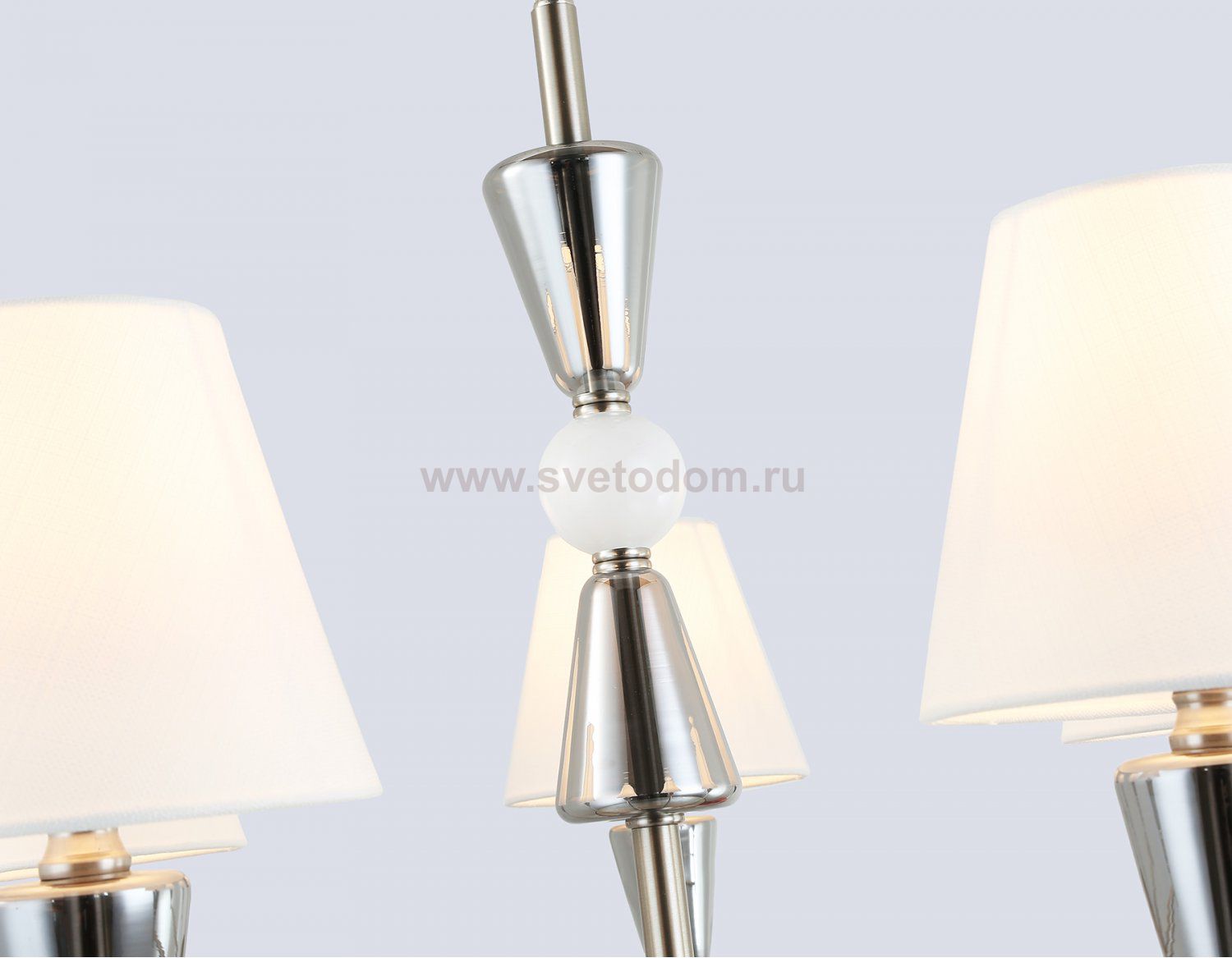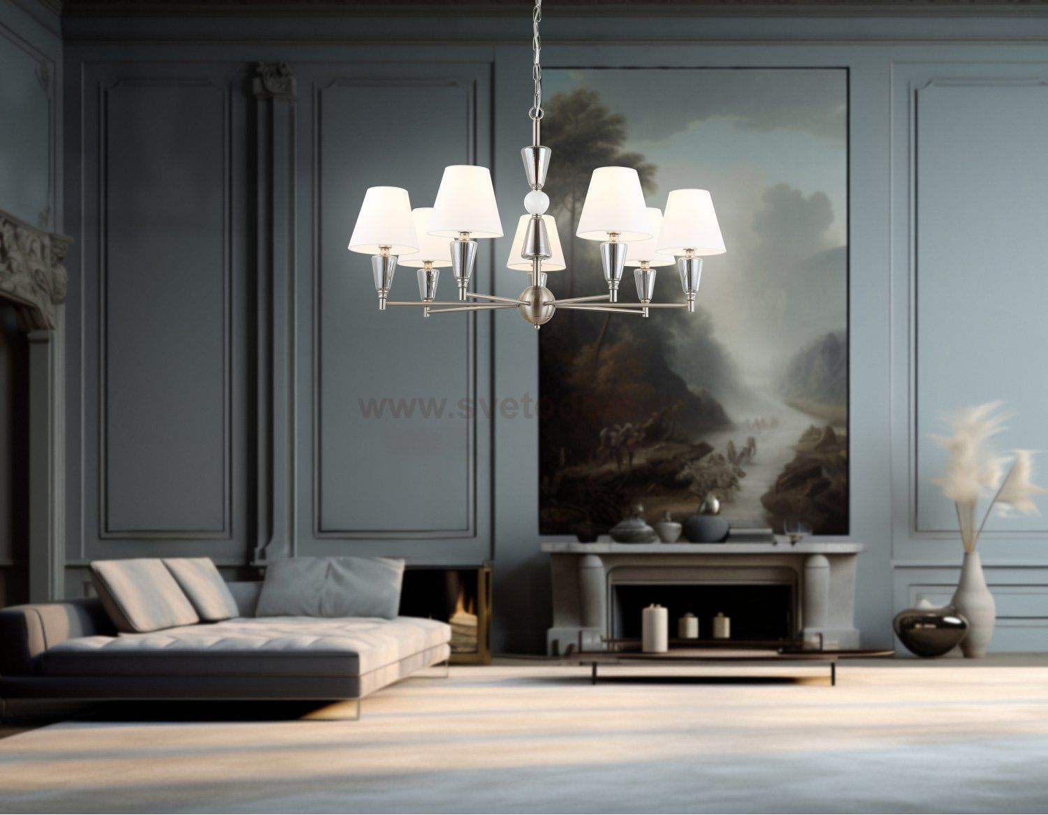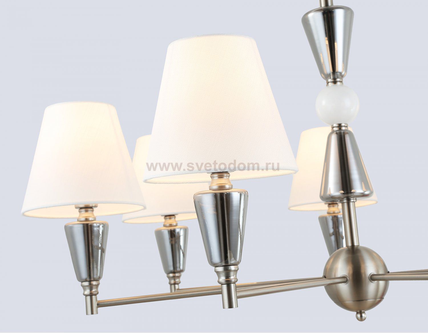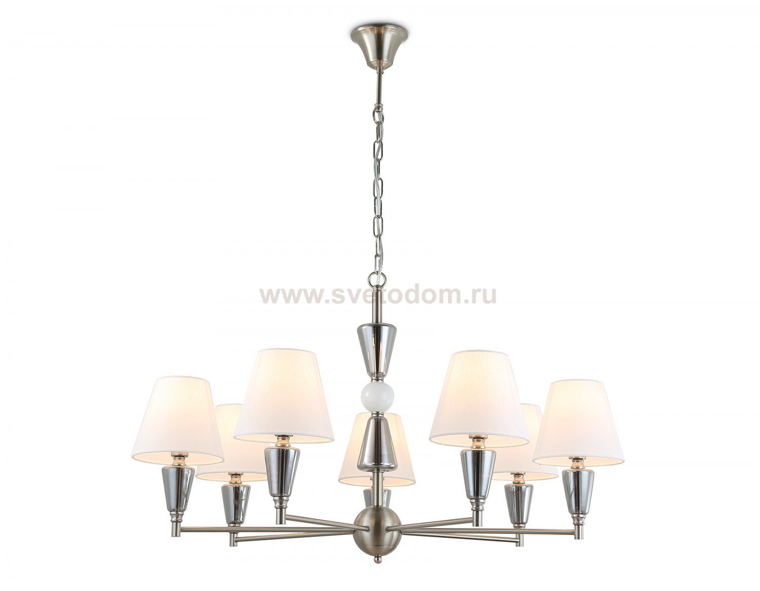 Подвесная люстра из коллекции HIGH LIGHT. Модель LH75256 представлена в стиле неоклассика. Люстра выполнена из металлического каркаса цвета сатин никель и белых тканевых абажуров, а также декорирована стеклянными элементами. Имеет семь цоколей Е14. Люстра будет прекрасным дополнением в любом помещении.