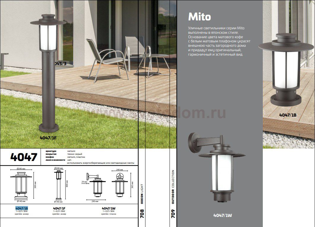 Уличный настенный светильник 4047/1W линии Mito выполнен в японском стиле. Основание цвета матового кофе с белым матовым плафоном украсят внешнюю часть загородного дома и придадут ему оригинальный, гармоничный и эстетичный вид. Цоколь E27. Мощность 1*18W. Нет ламп в комплекте.