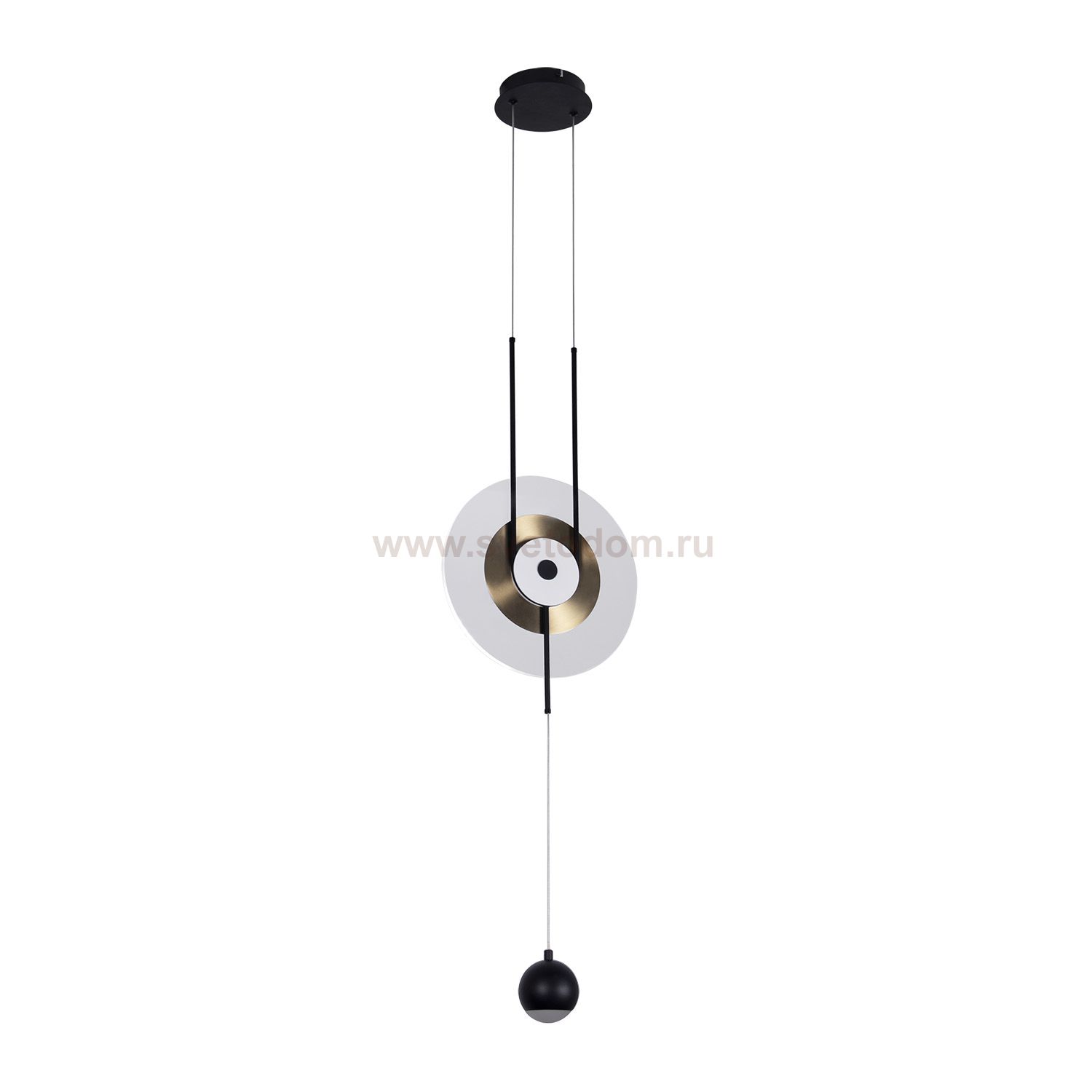 Подвес с каркасом в черном цвете, с двумя источниками света: первый источник - декоративный латунный диск с акриловым плафоном и встроенной лентой LED Декор