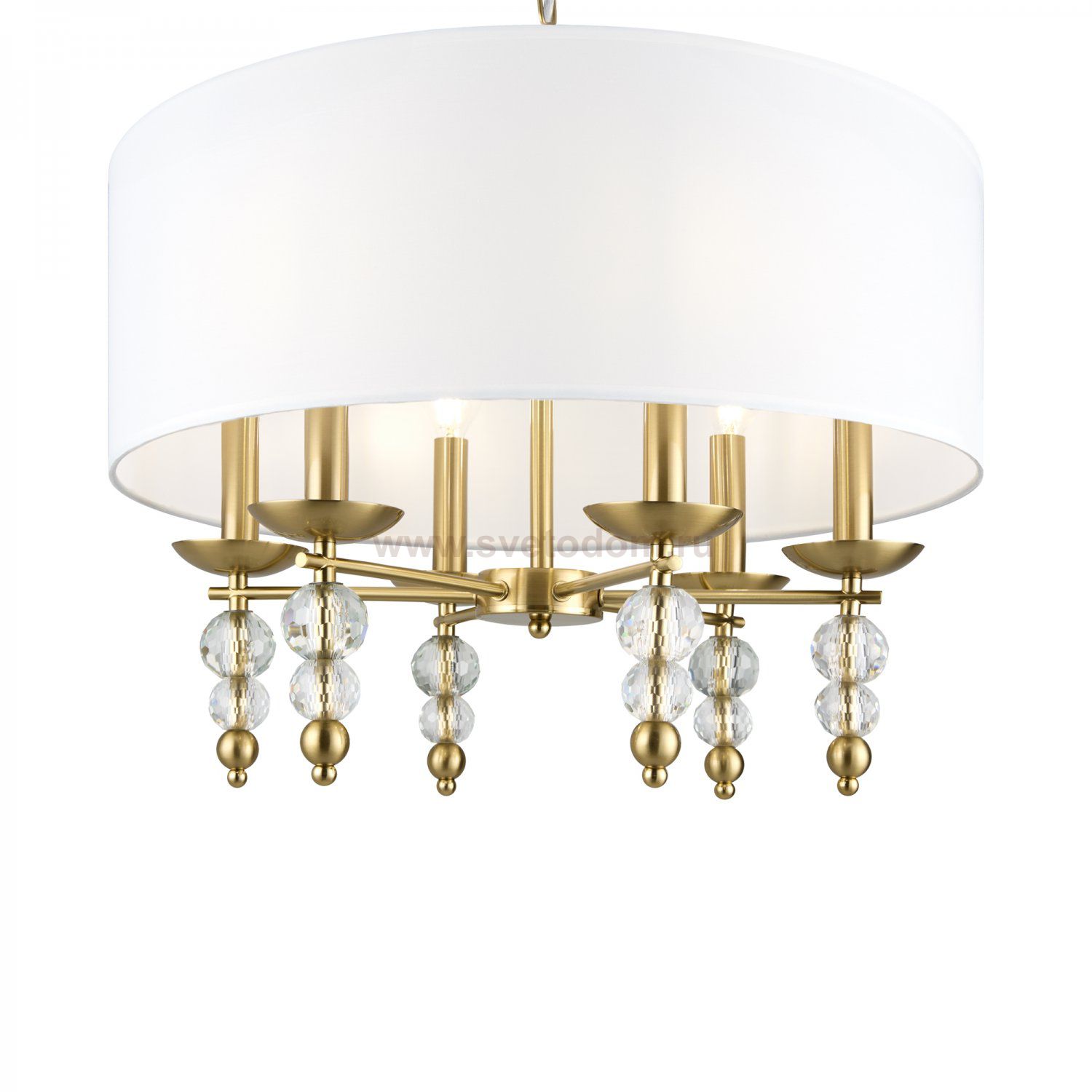 Материал абажура — ткань, цвет — белый. Металлическая арматура в цвете латунь обрамлена хрустальными бусинами. Источник света — лампы с цоколем Е14. Степень защиты — IP20.