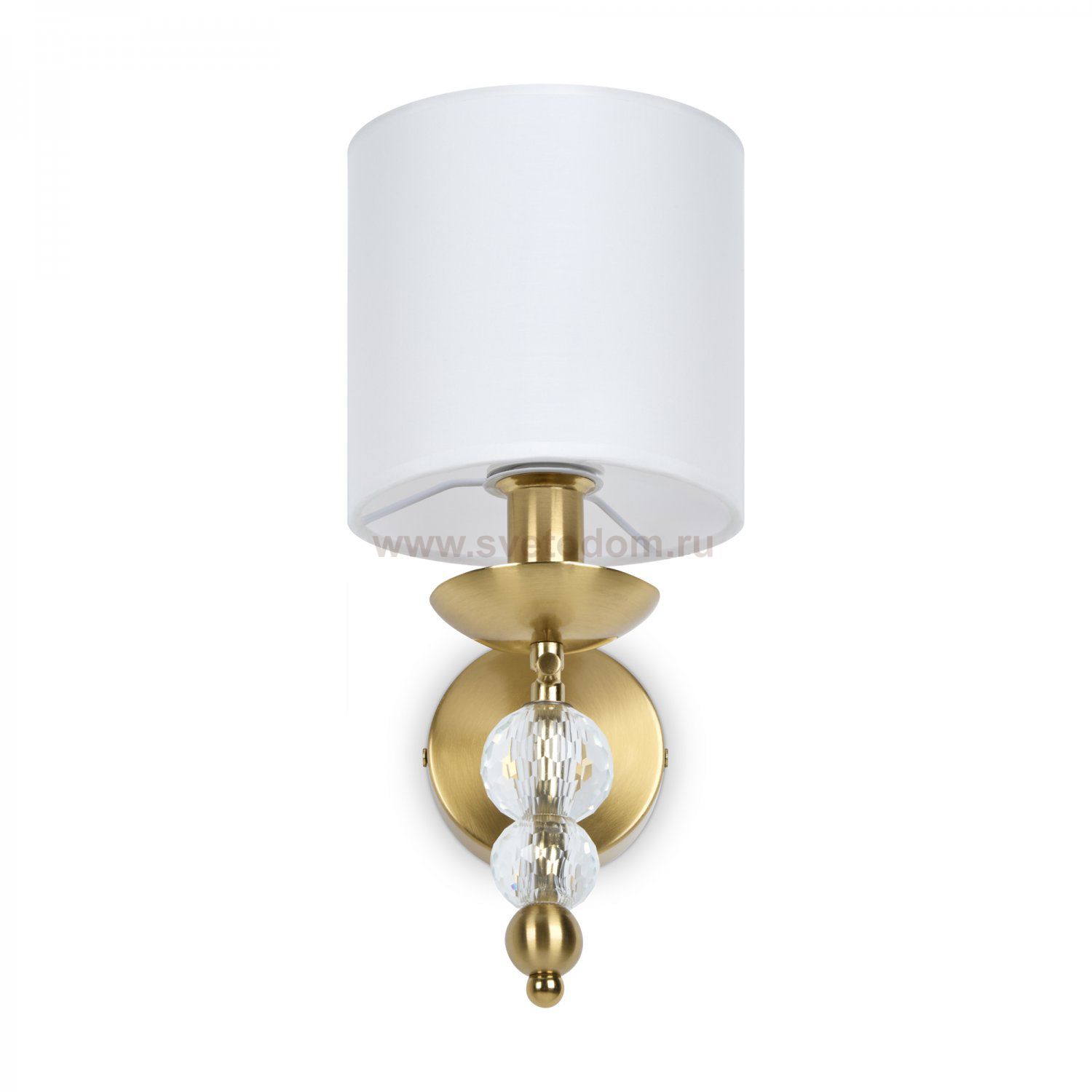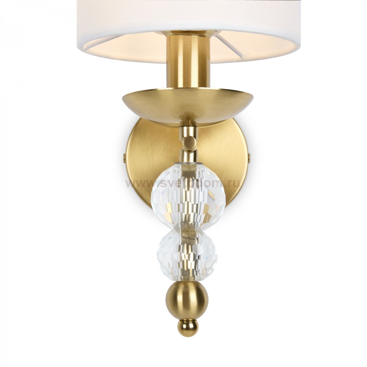 Материал абажура — ткань, цвет — белый. Металлическая арматура в цвете латунь обрамлена хрустальными бусинами. Источник света — лампы с цоколем Е14. Степень защиты — IP20.