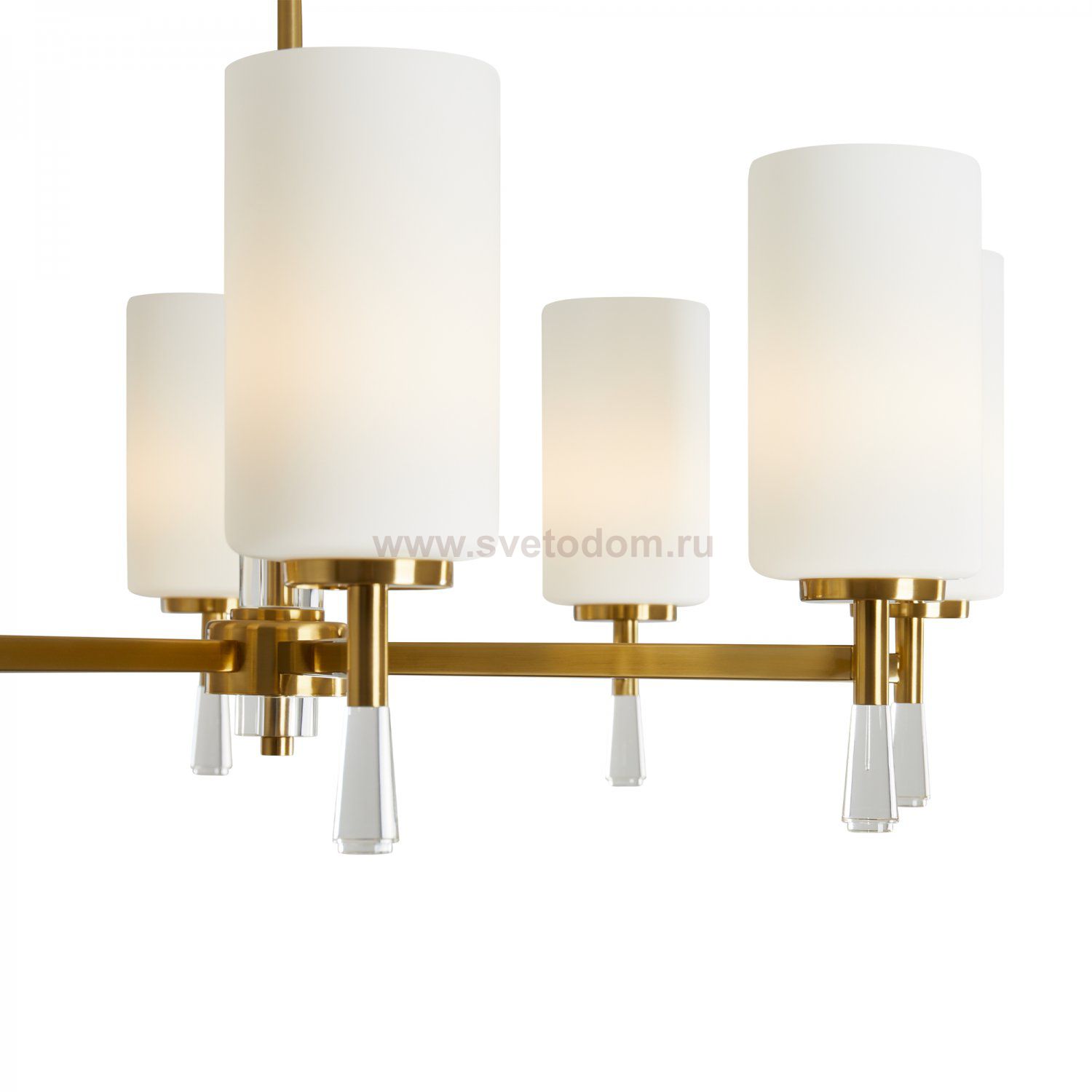 Арматура металл. Цвет латунь. Стеклянные белые плафоны хорошо рассеивают свет, направлены вверх, тем самым вытягивают потолок. Декоративные элементы в виде хрустального основания и капель из акрила. Источник света — лампа. Цоколь E27.