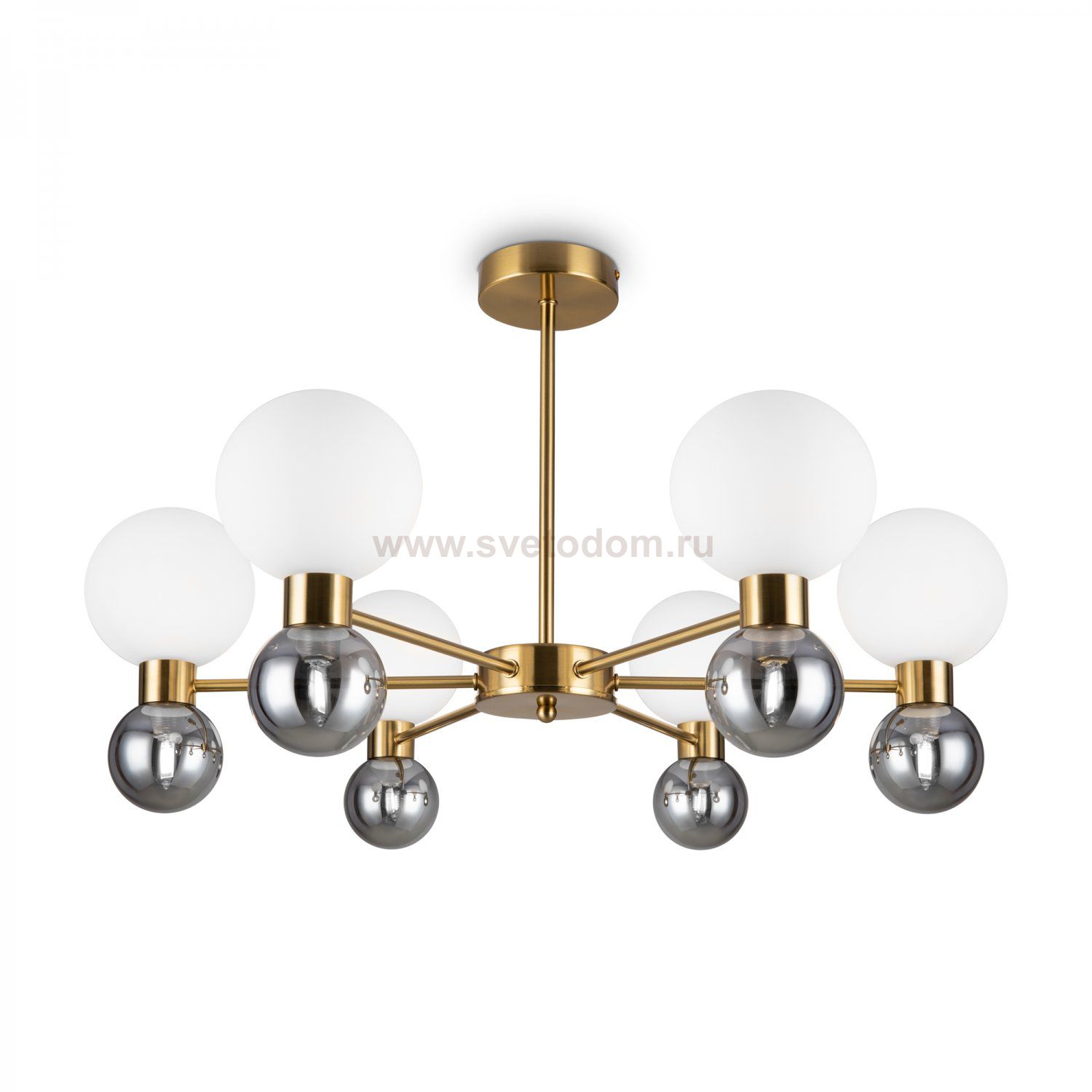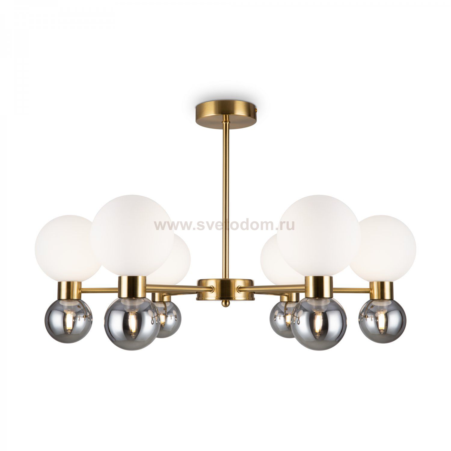 Металлическая арматура в цвете латунь. Открытые сферические плафоны в 2-х цветах: тёплый белый и тёмный гальванизированный. Плафоны разделены металлической вставкой в цвет арматуры. Источником света является лампа с цоколем G9. Для бра - цоколь Е27.