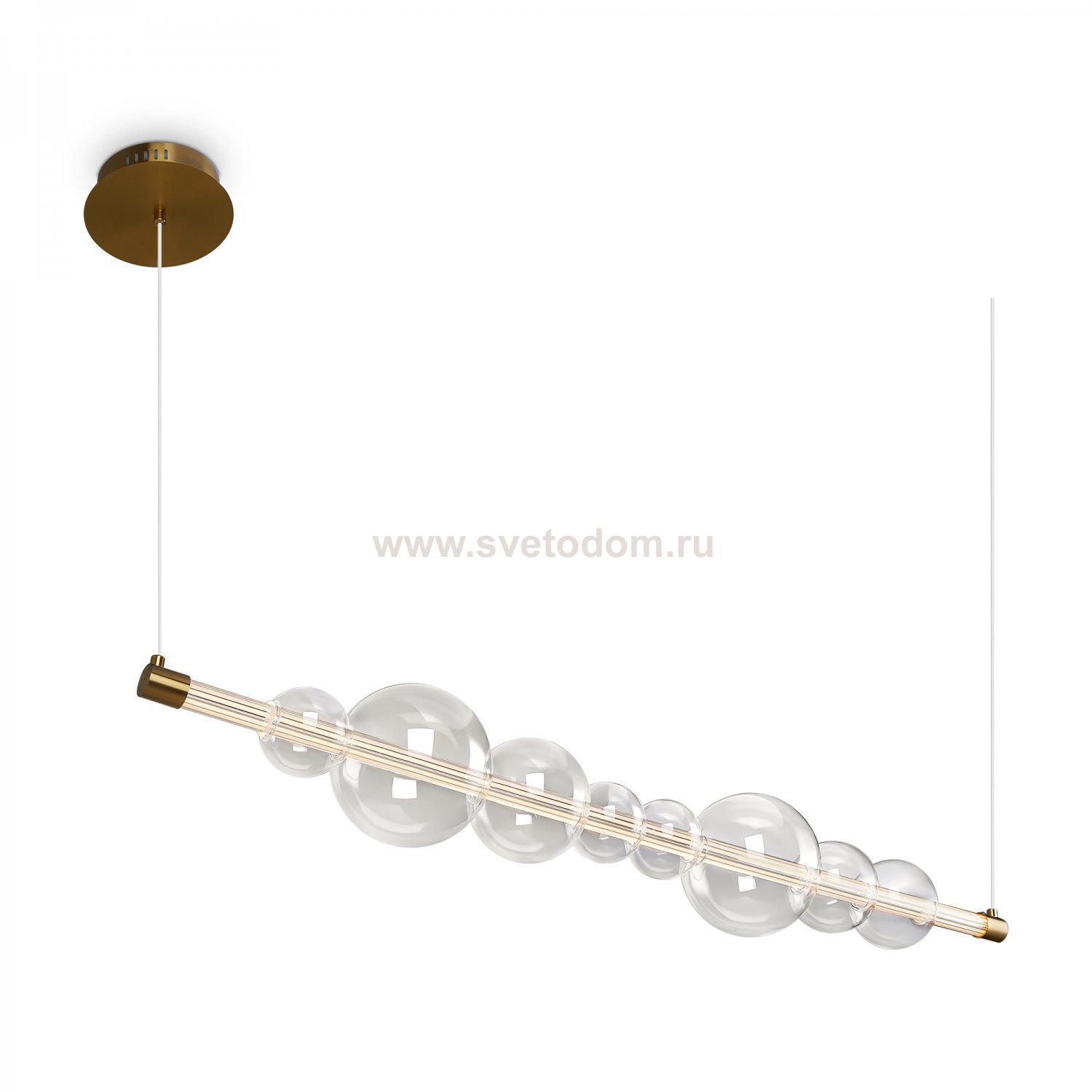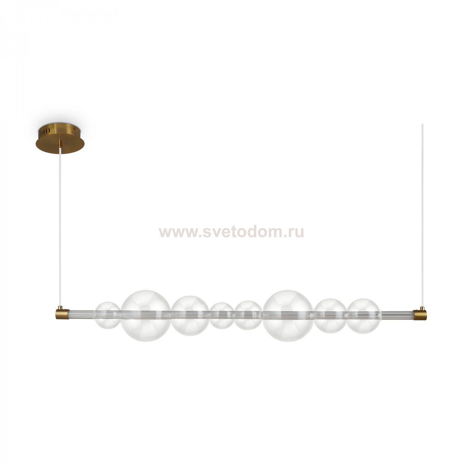 Арматура — металл, цвет — латунь. Тренд «invisible light» - LED-источник света скрыт в горизонтальной стеклянной трубке, пронизывая ряд декоративных плафонов-шаров разного размера из прозрачного стекла. Воздушная минималистичная горизонтальная конструкция. Регулируемая высота. Цветовая температура - 3000К.