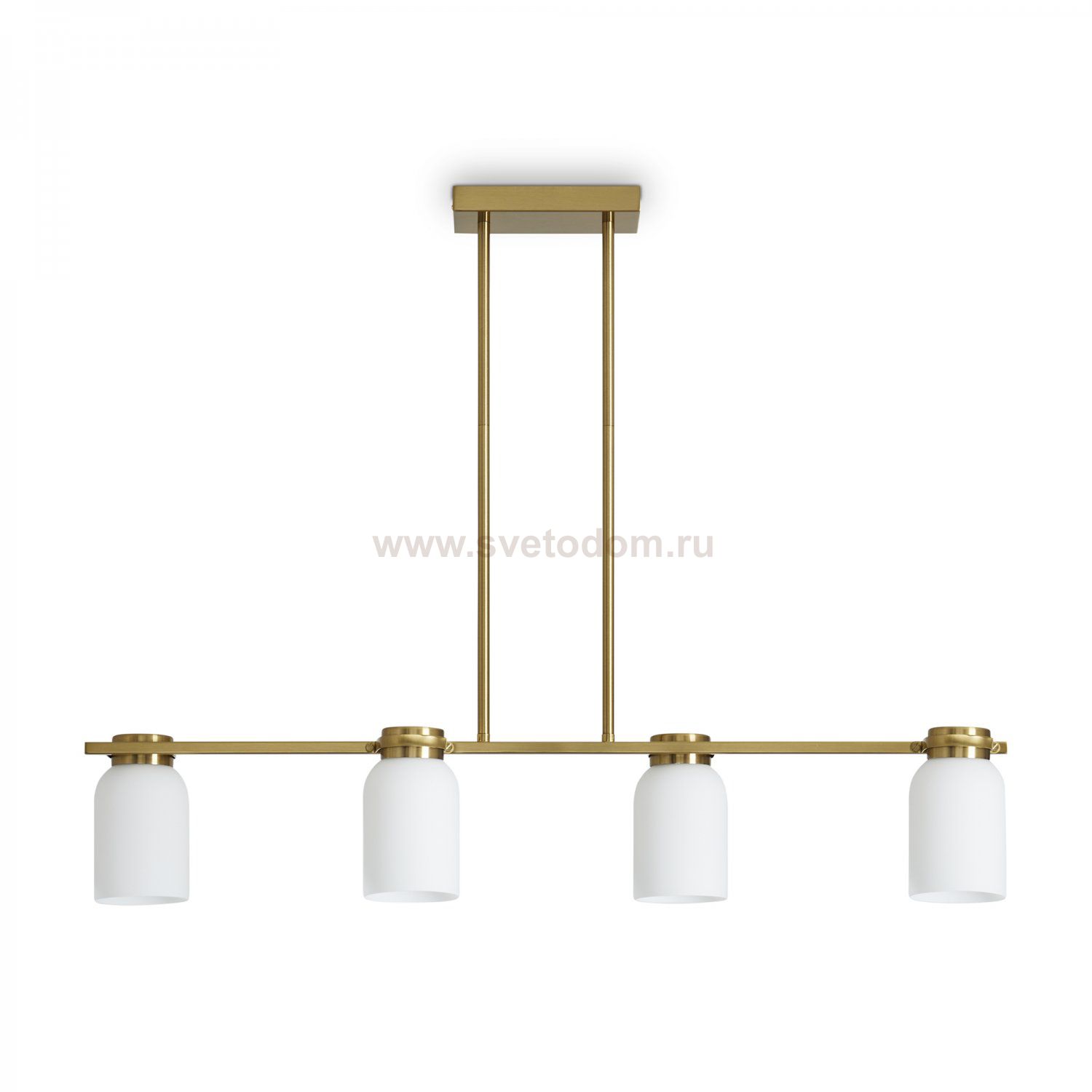 Арматура из металла. Цвет латунь. Плафоны из белого стекла новой необычной формы. Два варианта светильников — потолочные и бра. Подходит для помещений с низкими потолками. Источник света — лампа. Цоколь E14.