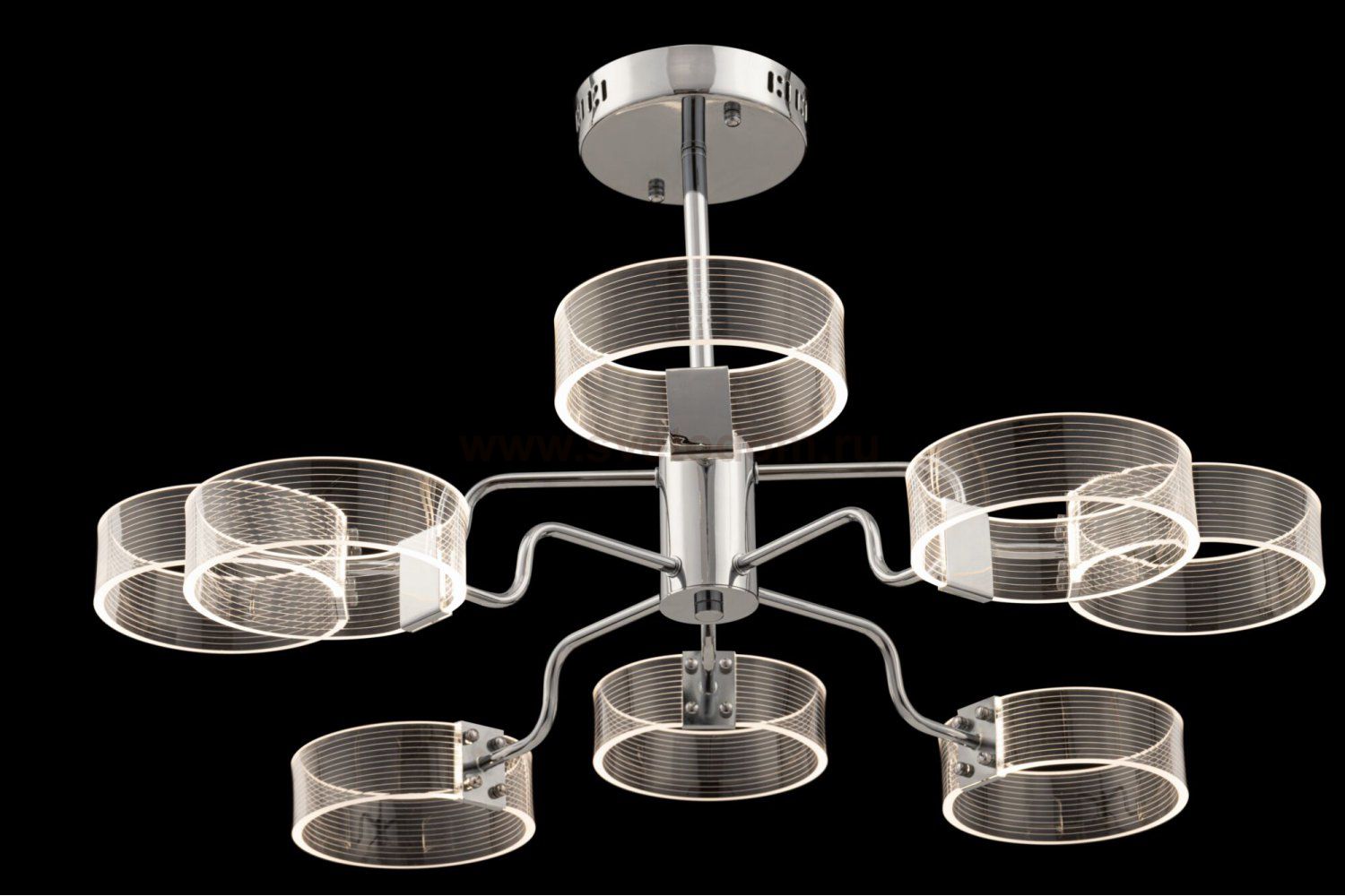 Серия Eva выполнена в современном стиле. Арматура сделана из металла в цвете хром. Плафоны из прозрачного акрила не рассеивают и приглушают свет, как в традиционных светильниках, а проводят его и делают светильники более яркими. Плафоны не меняют своего положения, декорированы микро-насечками, благодаря которым создается дополнительный световой рисунок. Серия представлена двумя потолочными светильниками на 8 и 6 рожков.