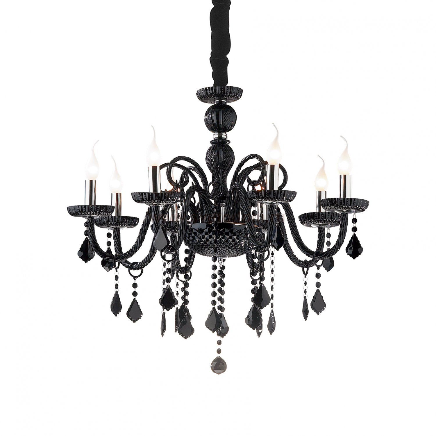 Люстра от известной итальянской фабрики Ideal lux из каталога Classico в венецианском стиле под артикулом GIUDECCA SP8 NERO (32511) серии GIUDECCA имеет ряд отличительных характеристик: Люстра из дутого стекла ручной работы с деталями из хромированного металла. Подвески с восьмиугольными хрусталиками и капли из хрусталя с фацетом. Цепь скрыта бархатной цепью.